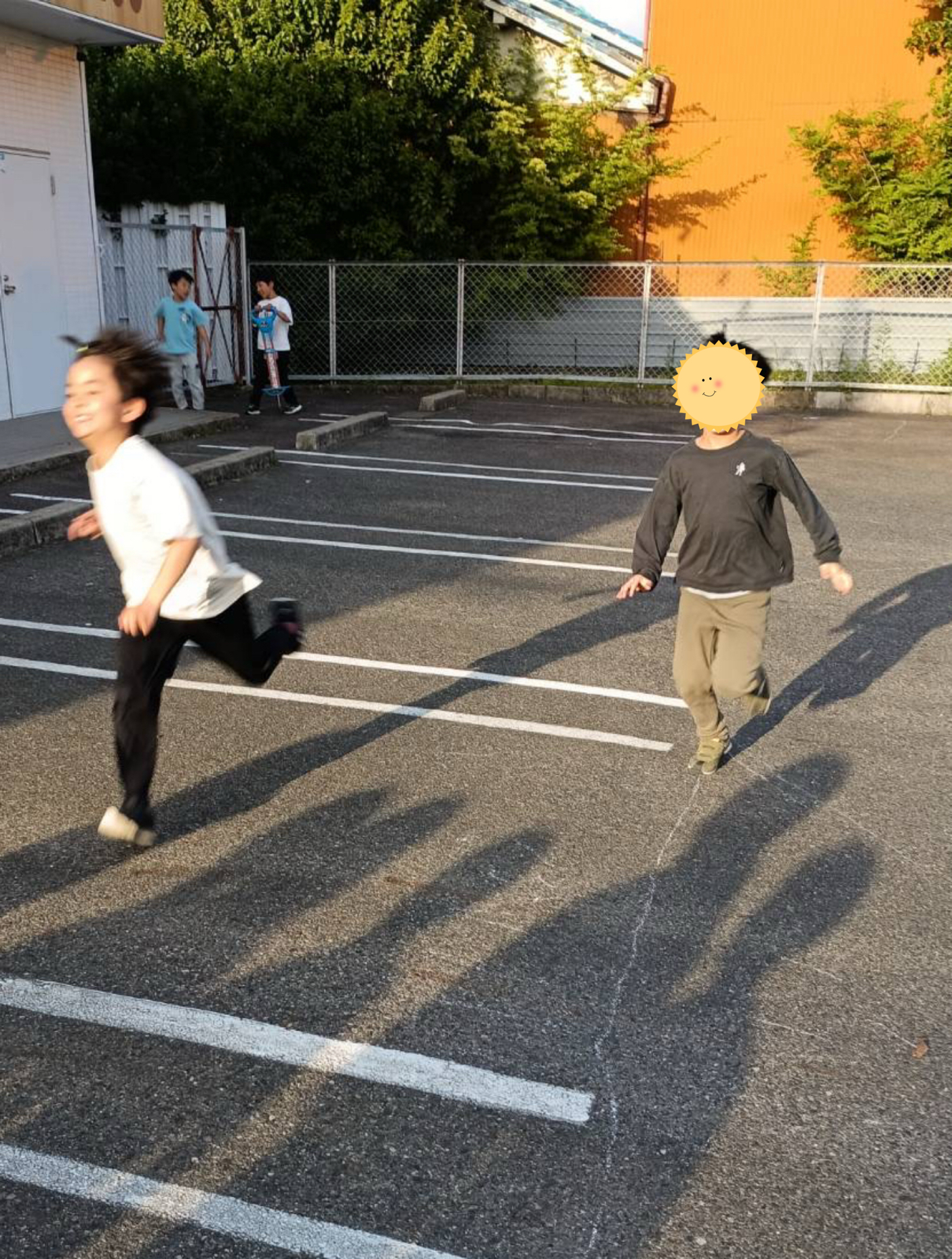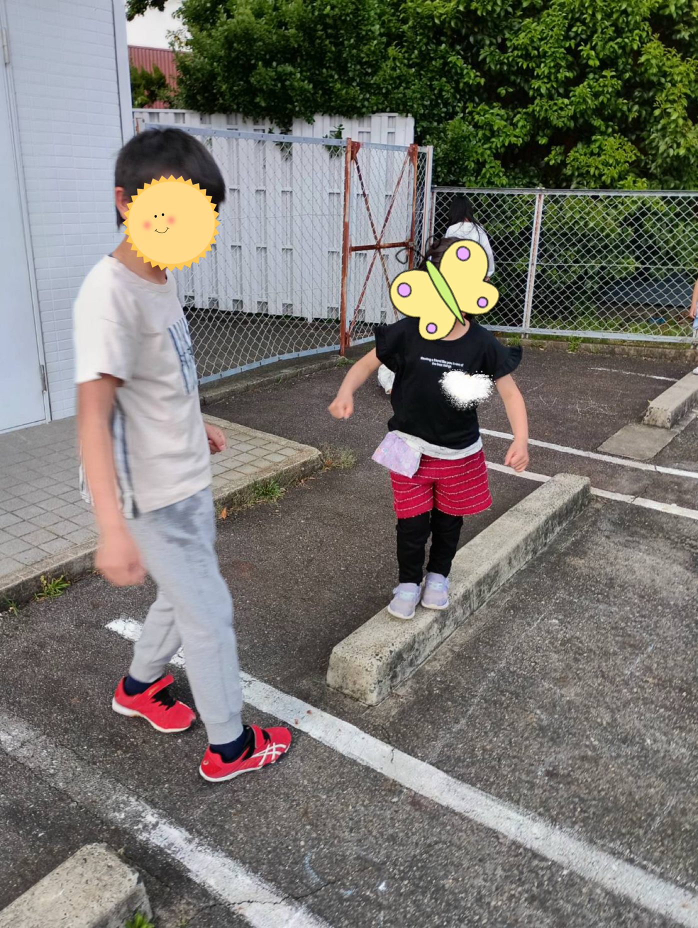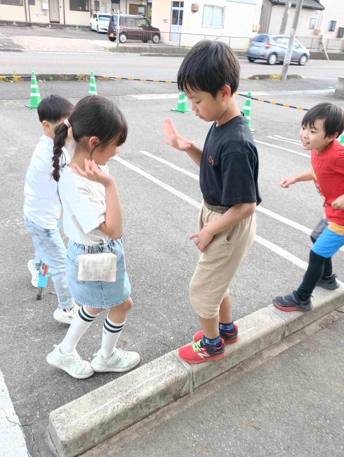 おやつの後は駐車場に出て遊ぶことに