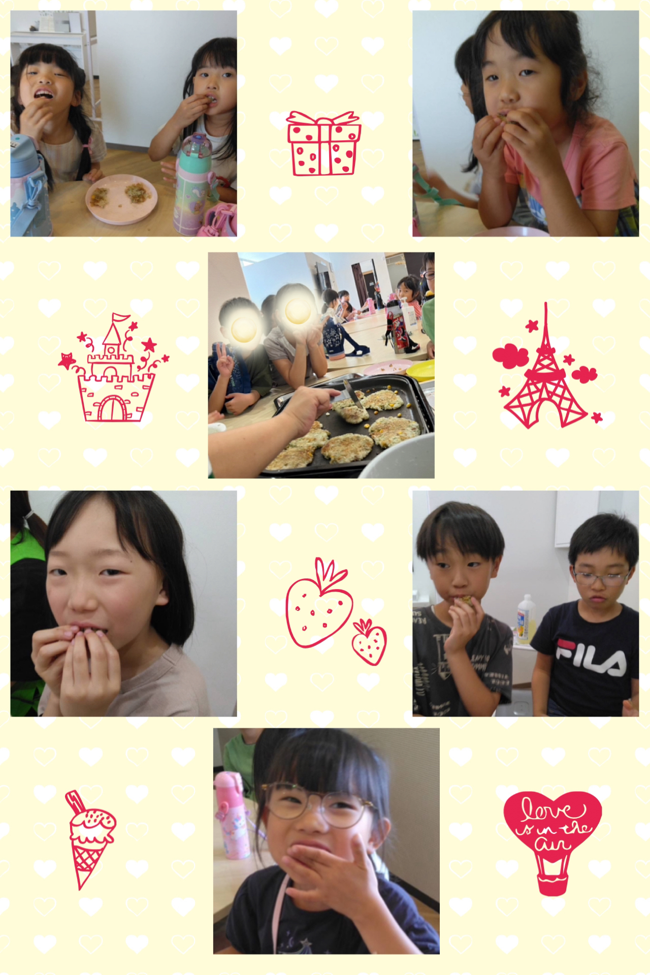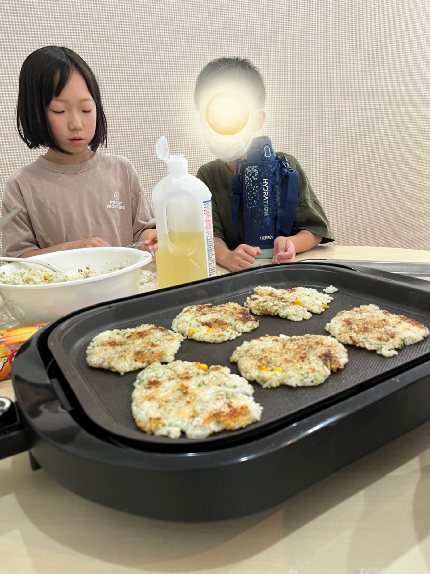お友だちがご飯を平らにするのを手伝ってくれて、ホットプレートで香ばしく焼いたらハイ、出来上がり!