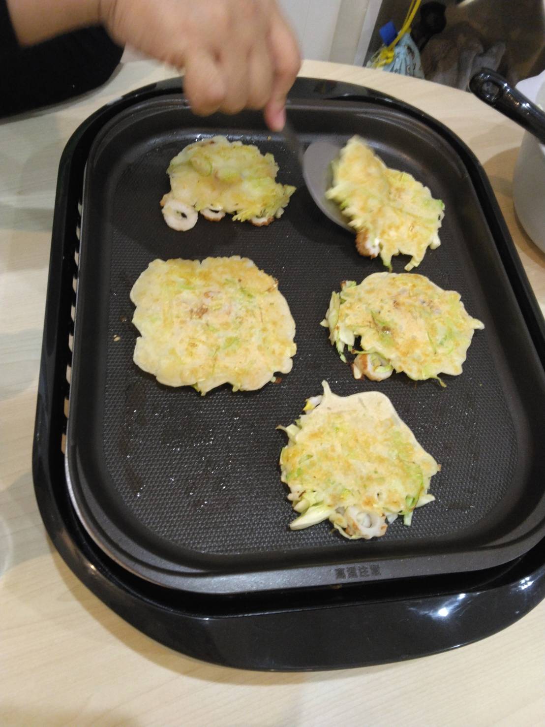 ホットプレートに生地を乗せると、美味しそうな匂いが周りに漂って来て、先生も思わずお腹が鳴っちゃいました😆