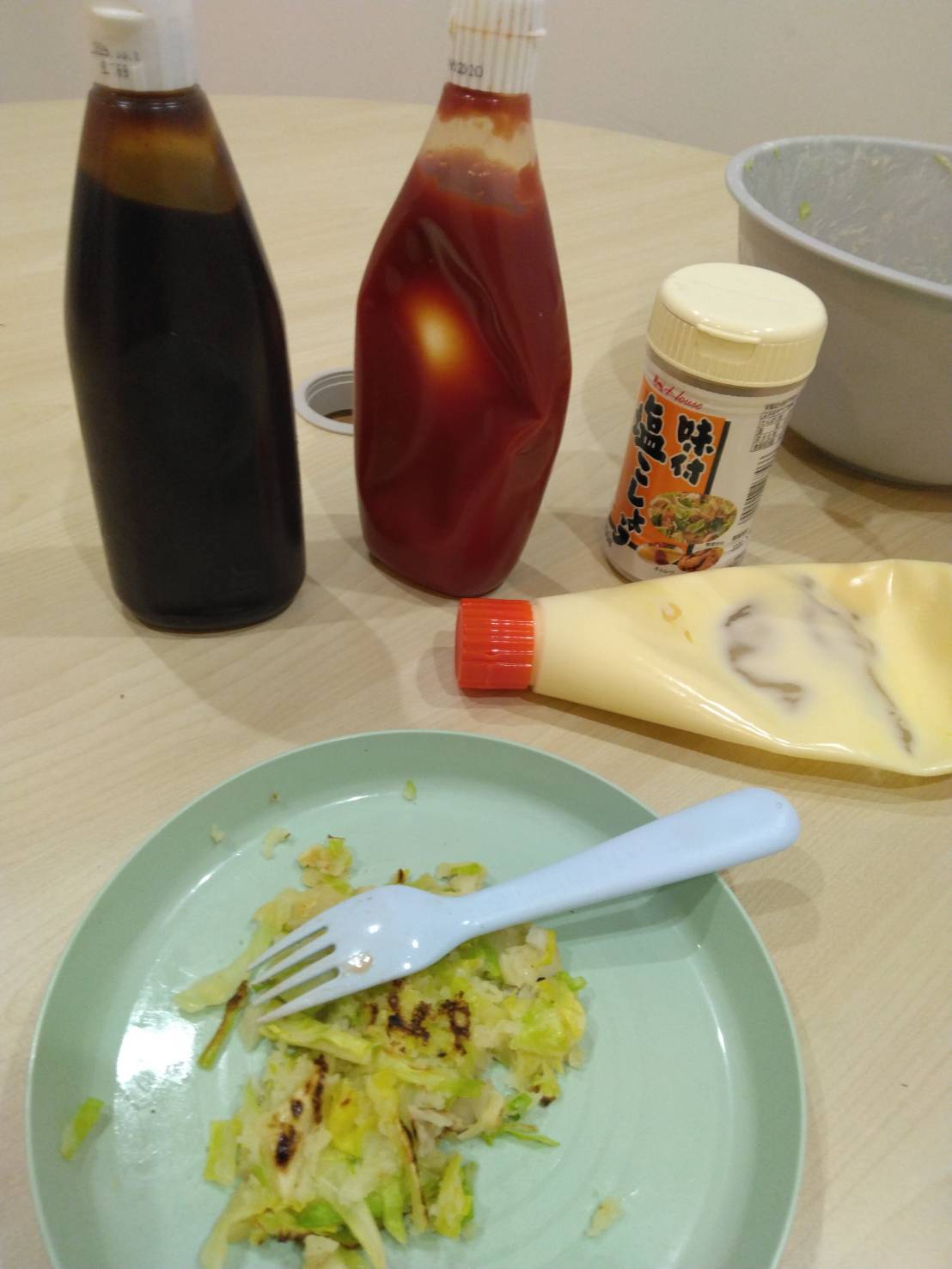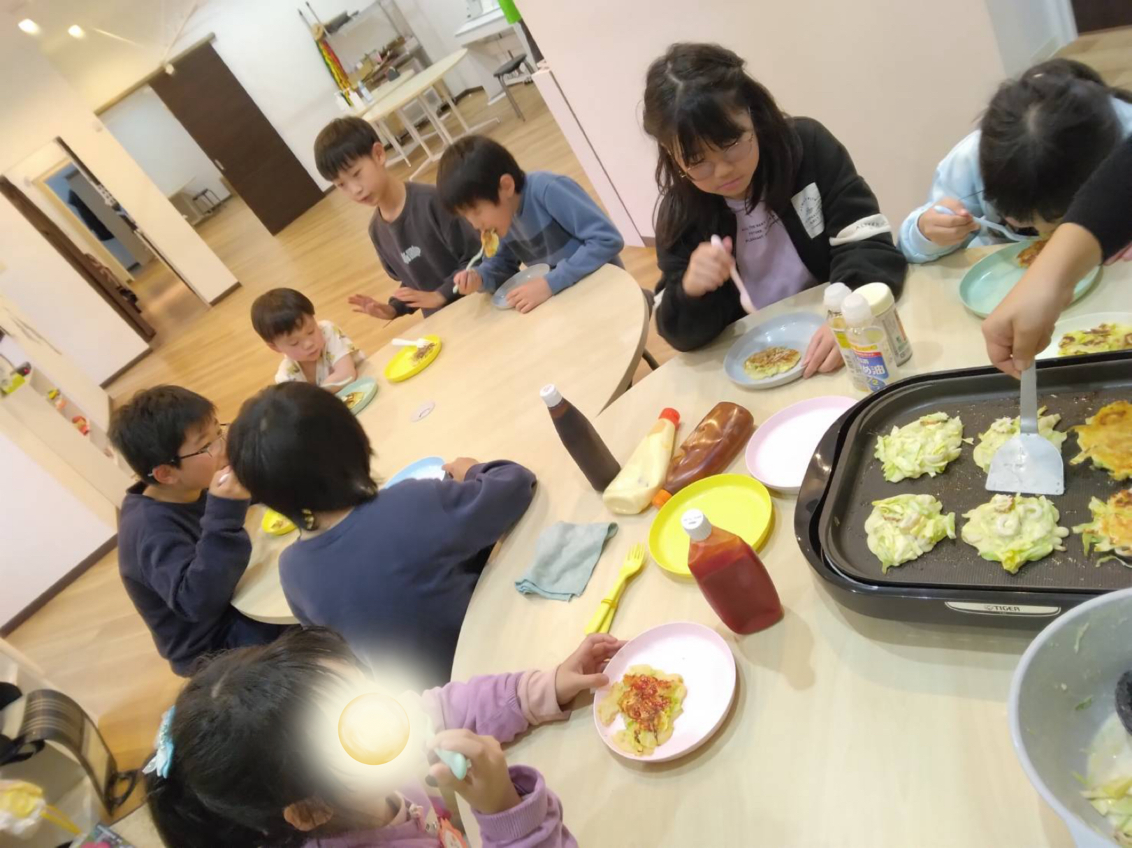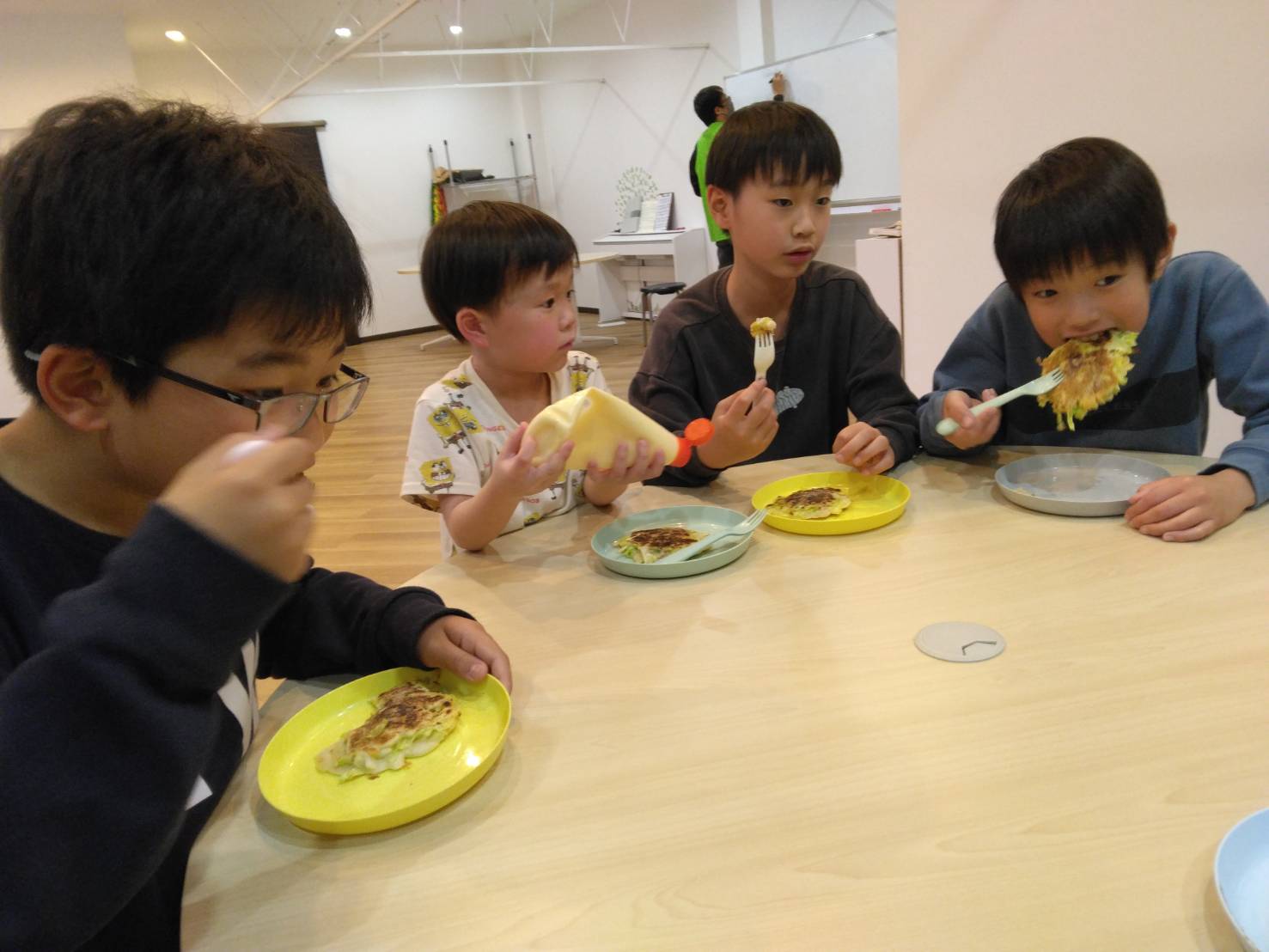子どもたちは、お好み焼きソースや、マヨネーズ、ケチャップに塩コショウなど、それぞれが好きな味付けをして食べていました。女の子達に人気だったのは、マヨネーズとケチャップを混ぜたオーロラソース。男の子には塩コショウだけをかけるシンプル派が多かったです。