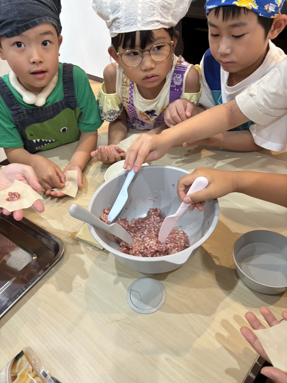 こちらはワンタン包みチームです。先生の話を聞きながら包んでいましたが、これまた上手でした。