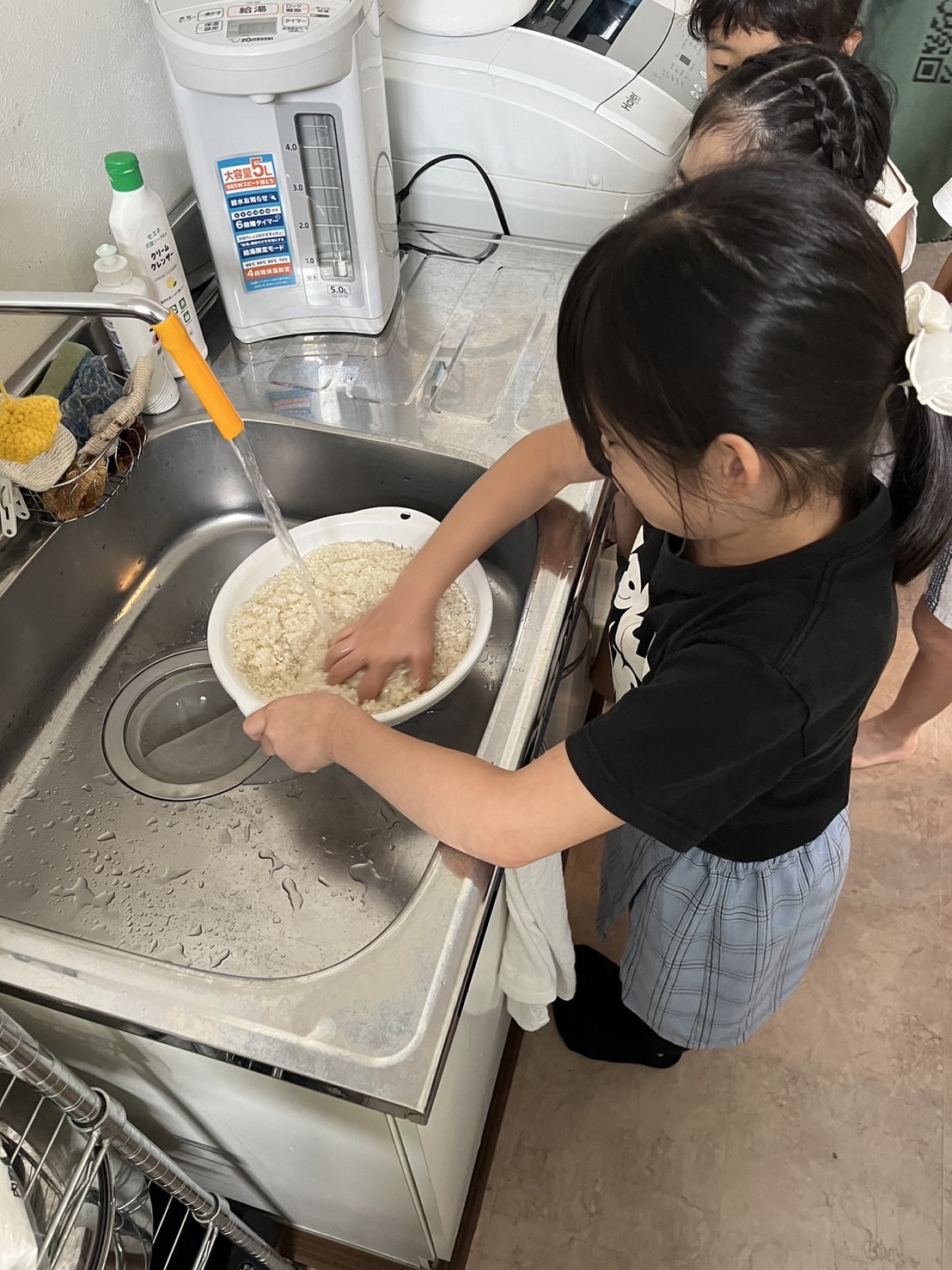 子ども達は調理チーム、テーブル拭きチーム、お皿洗いチームと分かれ、それぞれの持ち場を頑張ります。