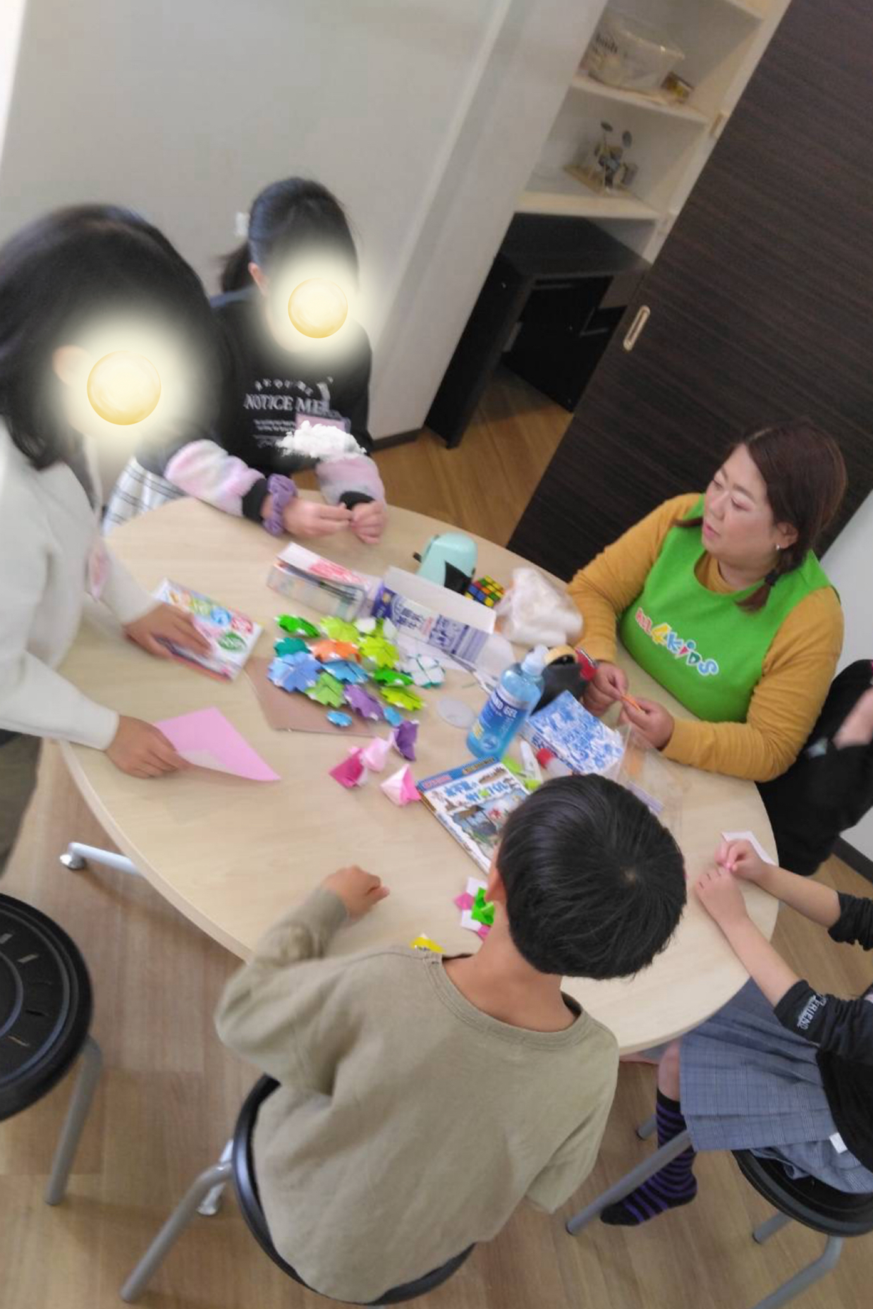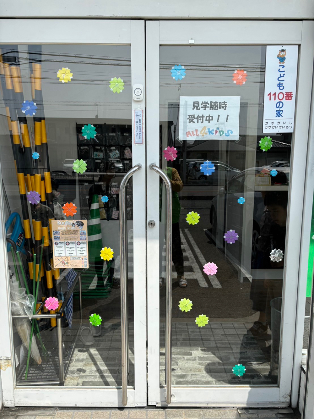 実は今日、新しくALL4に来てくれたお友だちが折り紙でクローバー🍀をたくさん折ってくれたので、玄関のドアを華やかに飾ってみました!