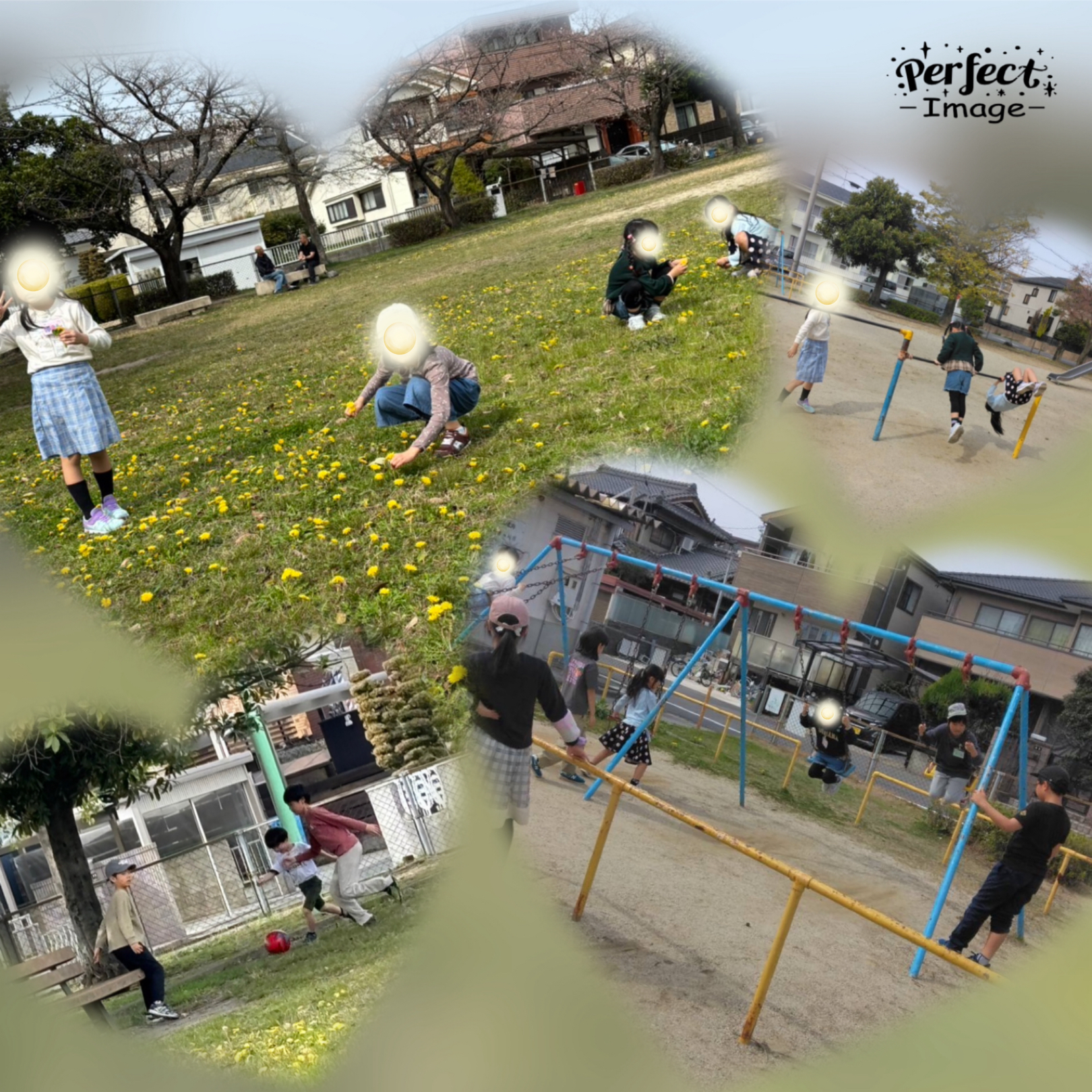 午後は下中公園に遊びに行きました。女の子は遊具で遊んだりタンポポを摘み、男の子はサッカーや鬼ごっこで公園中を走り回っていました!