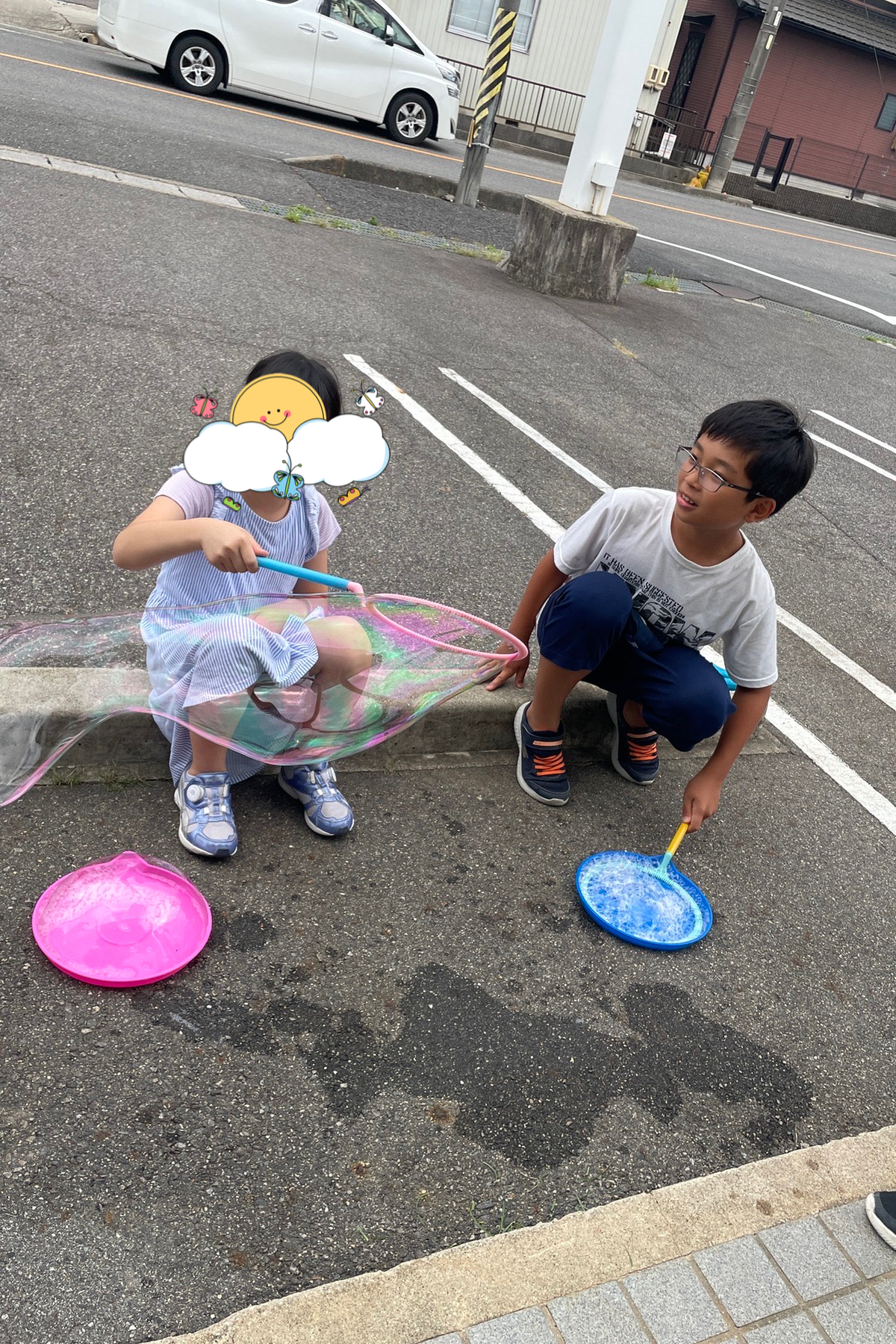 大きなシャボン玉作りに夢中に最近なっている子ども達です。