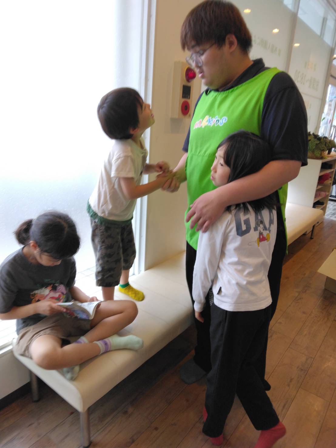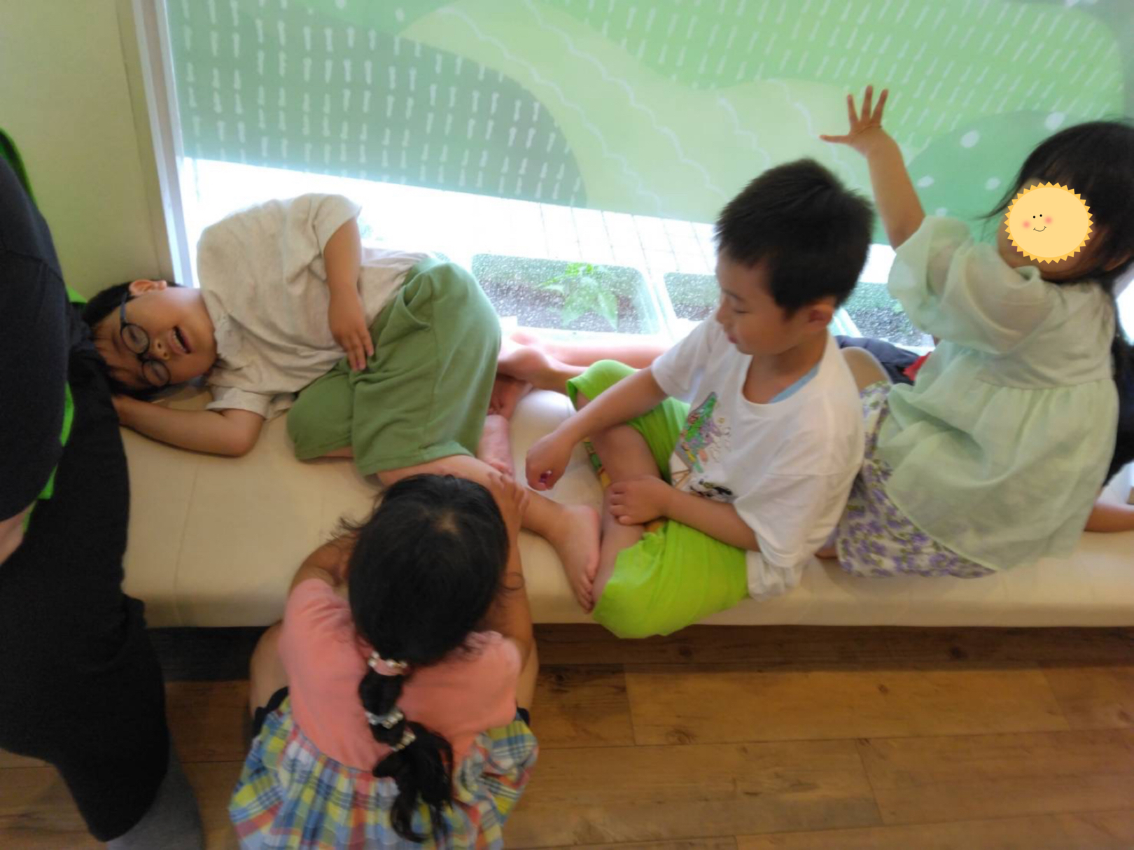 こちらはみんなでベンチに集まっていました。何か特別遊んでいるわけでもないんですが、ただ集まっているだけでも楽しい様子😀