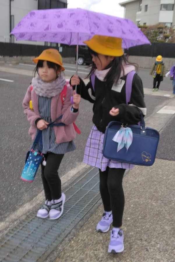 三年生が学校から帰る頃には少しづつ雨が降り出したので、こちらの女の子は仲良く二人で傘に入って楽しそうにおしゃべりしていましたよ。