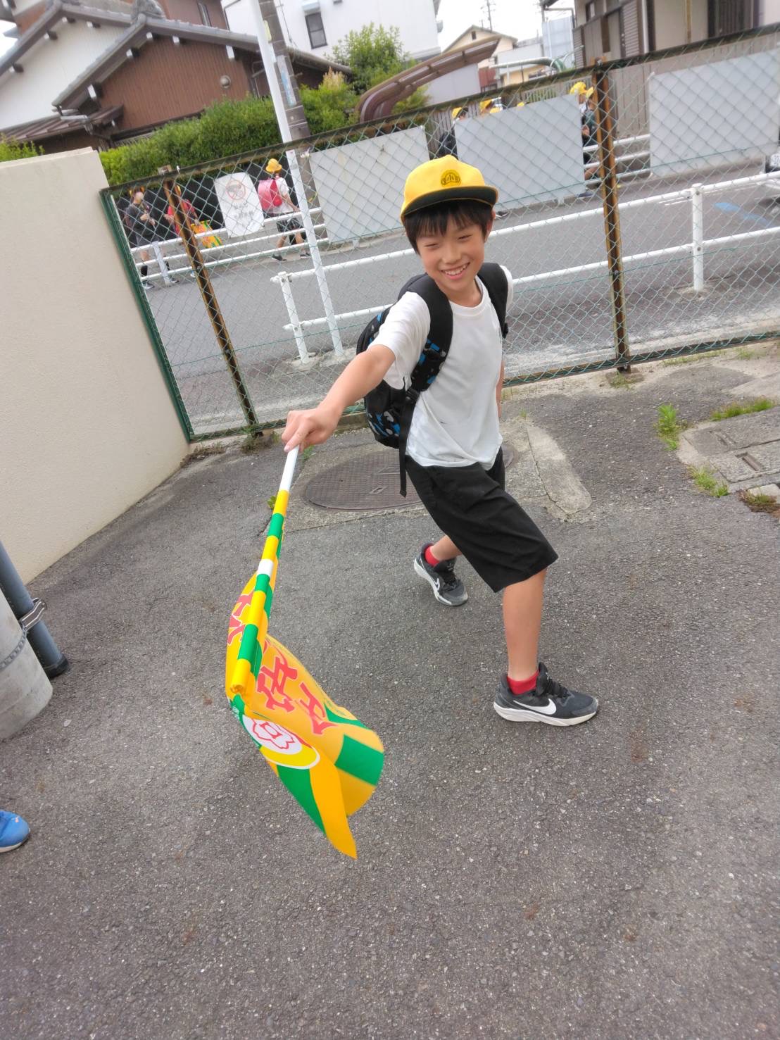 通学班の旗を5年生から預かった男の子が「班の呼吸 四の型…”見守り!”」と言って旗🚩を振っていたので思わずパチリ📸✨