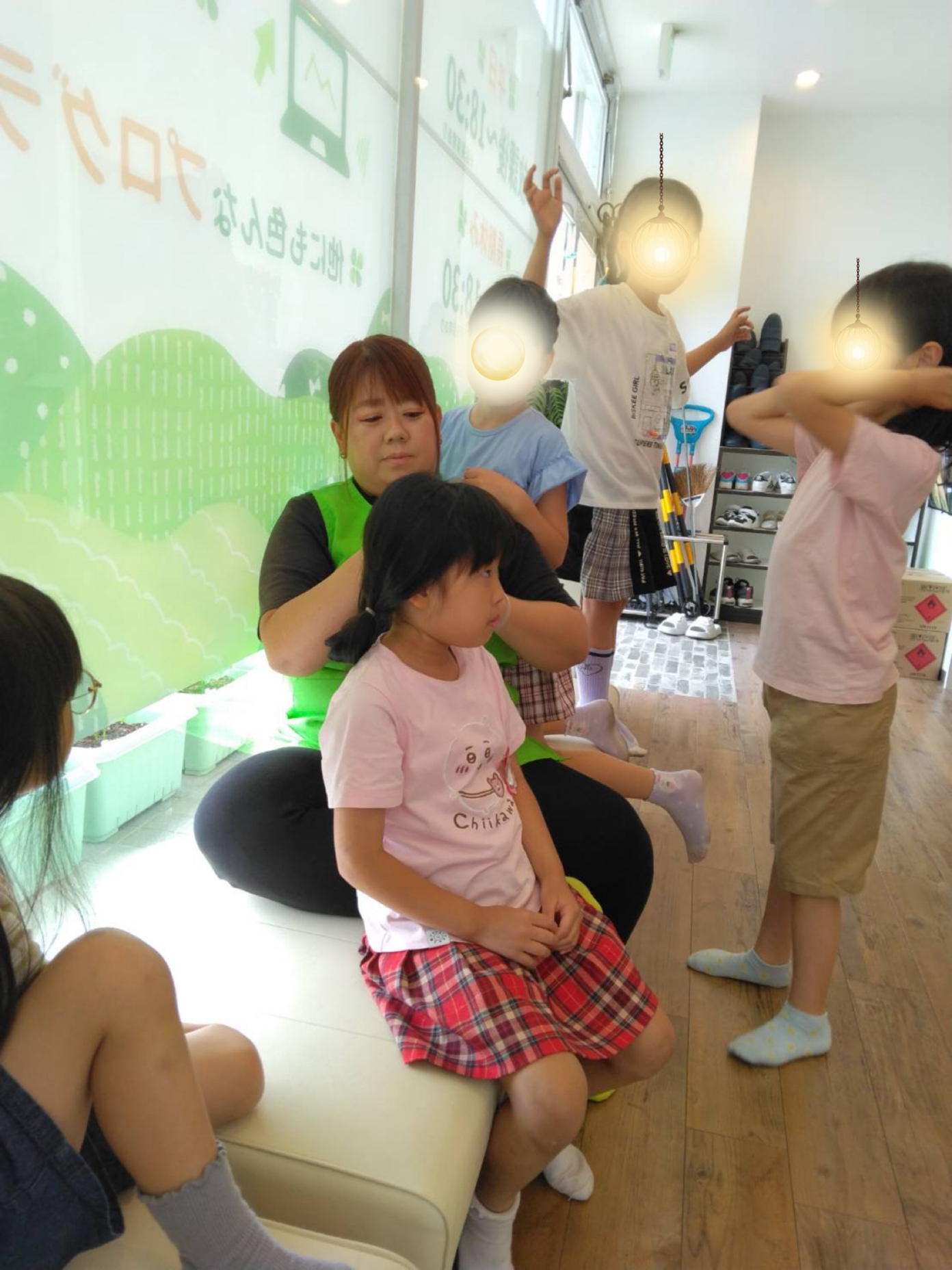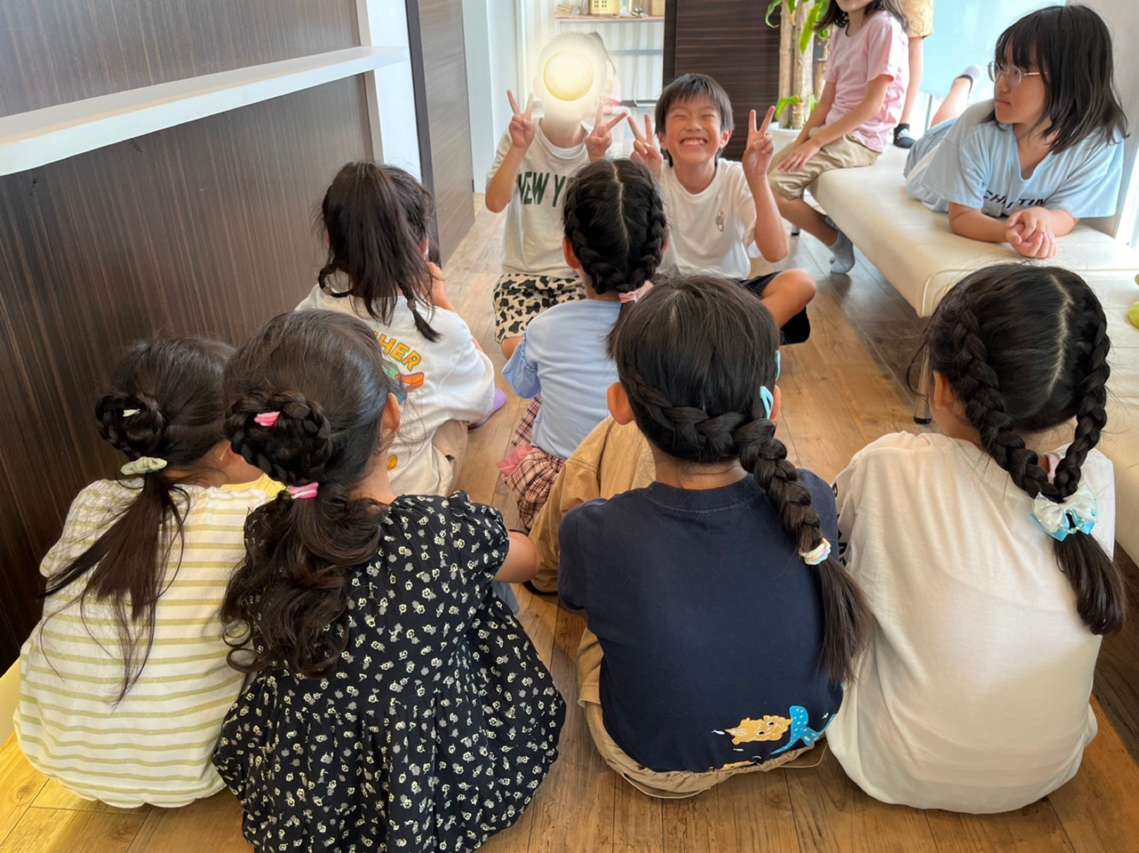 その後、ソファでは女の子達が先生に髪を編んで貰っていました👧