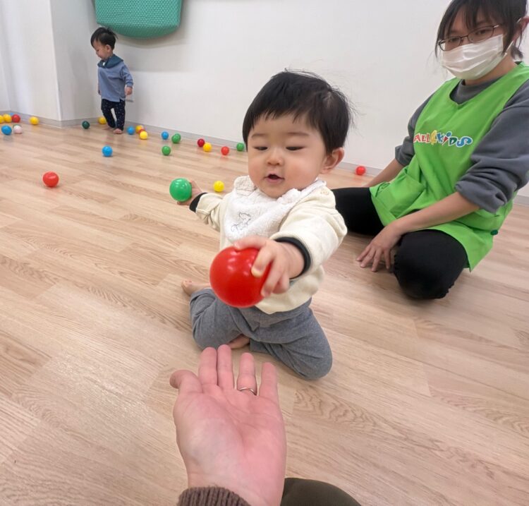 0歳児クラスは室内で、ボール遊びをしました![]()