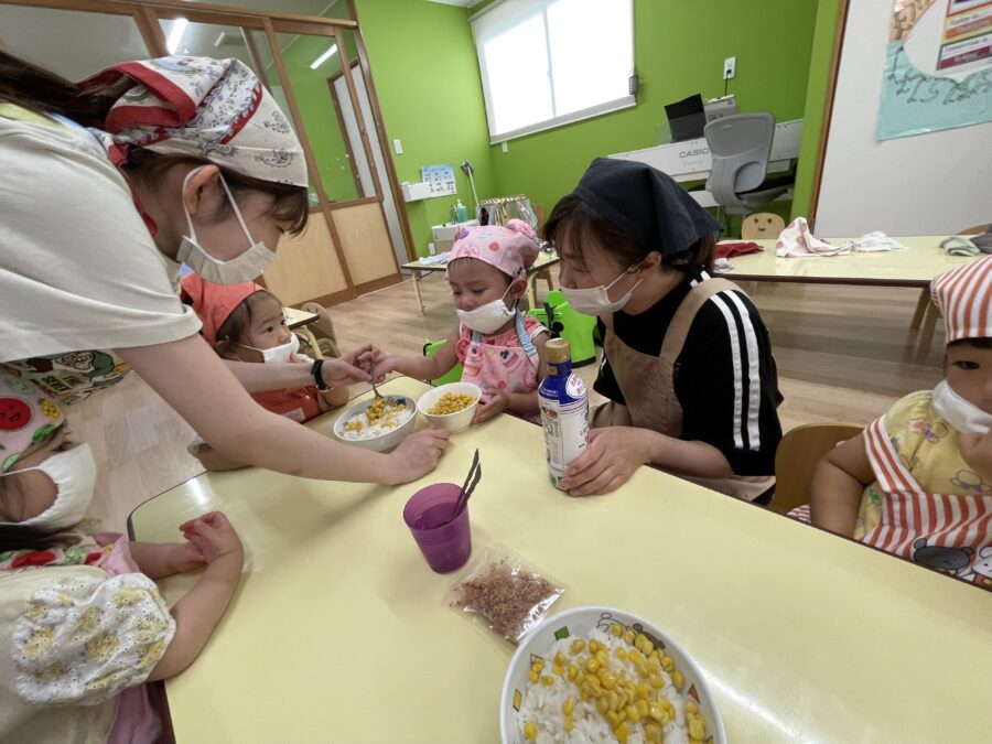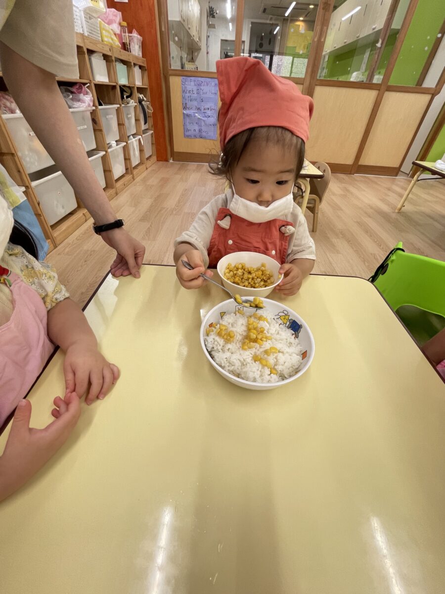 おにぎりの見本を見せて今日のクッキング始まるよー🌽