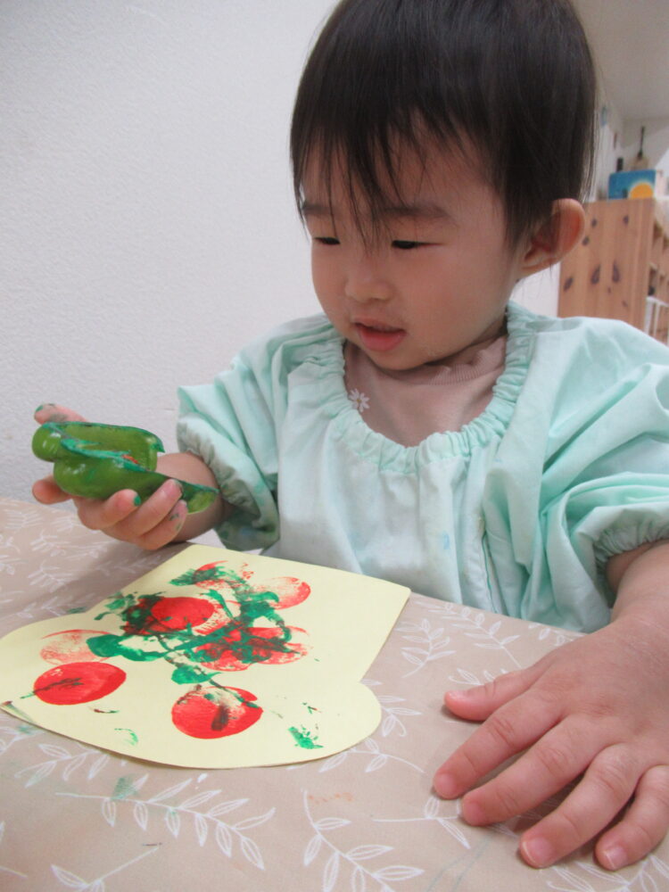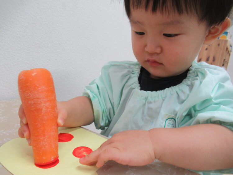 知っている野菜から、こんな形の跡がつくのに、取り組んでいる子ども以外に隣で見ていたお友だちも興味深々な様子でした🥕