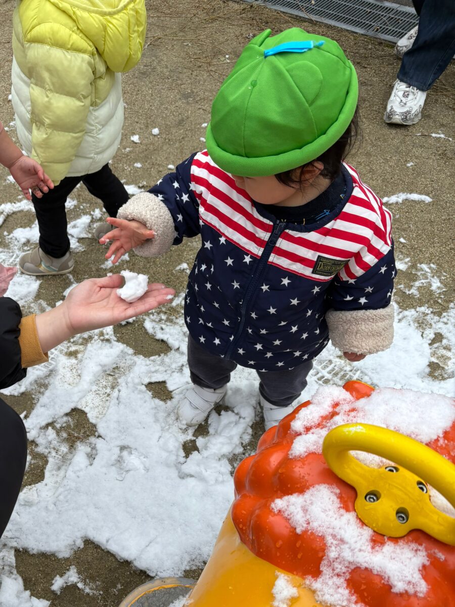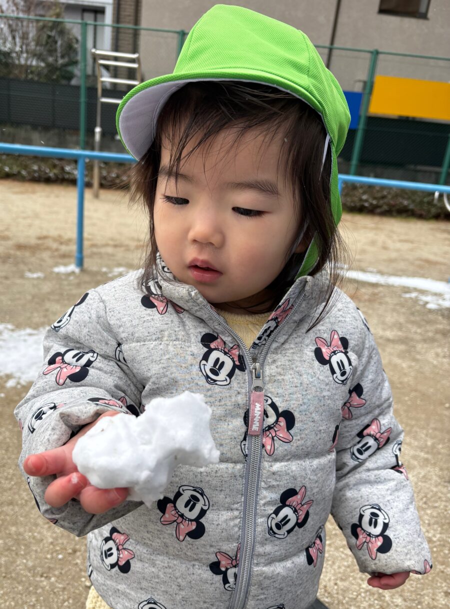 ※雪が降った日は、戸外遊び(雪遊び)を行いますので、手袋・スノーブーツ・ウェア・靴下厚手・ニット帽など準備して頂けると有難いです。