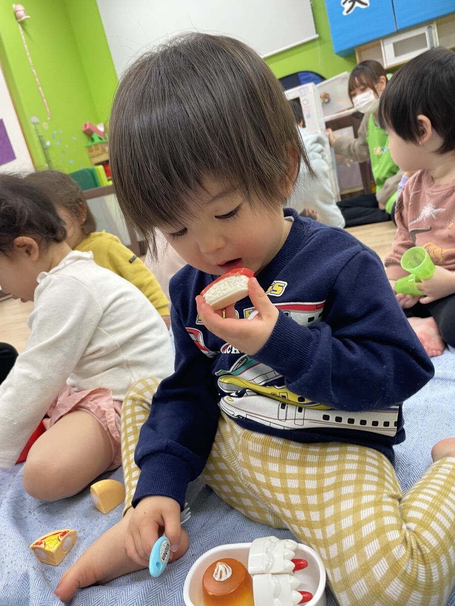 こちらのお友だちは「おすし!」といいながら嬉しそうに食べています🍣