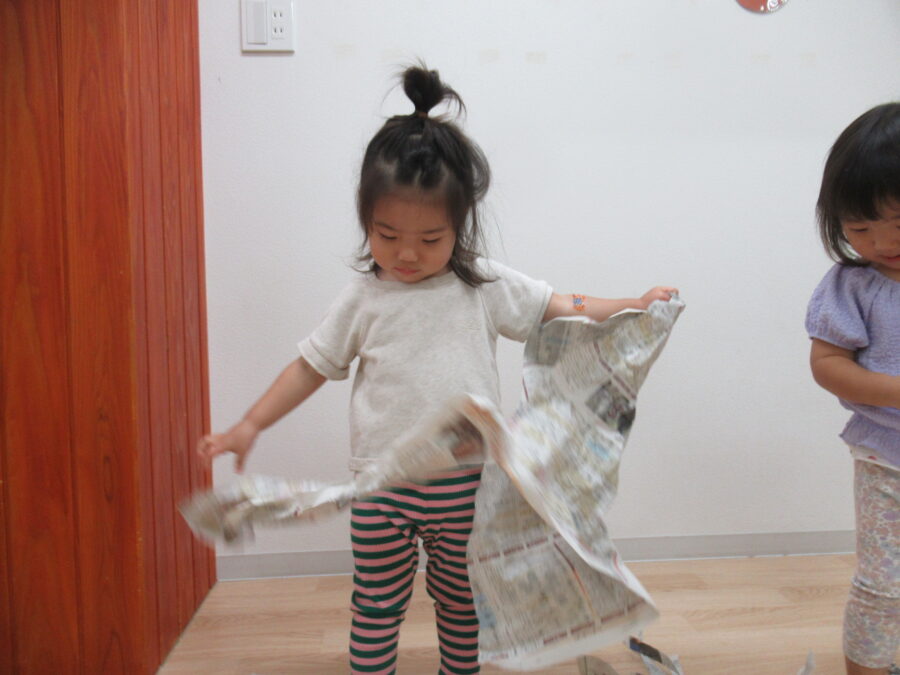 細長くやぶってみたり、やぶった新聞を丸めてボールにしたりとおもいおもいにあそんでいる子どもたちです![]()