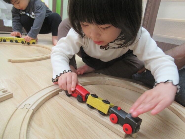 組みたてたレールから電車を落とさないように慎重に走らせています。