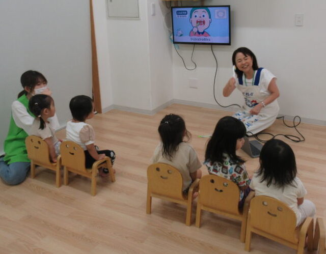 歯の大切な役割のお話を聞いたり、音楽に合わせて「歯磨き方法」を楽しく学びました。