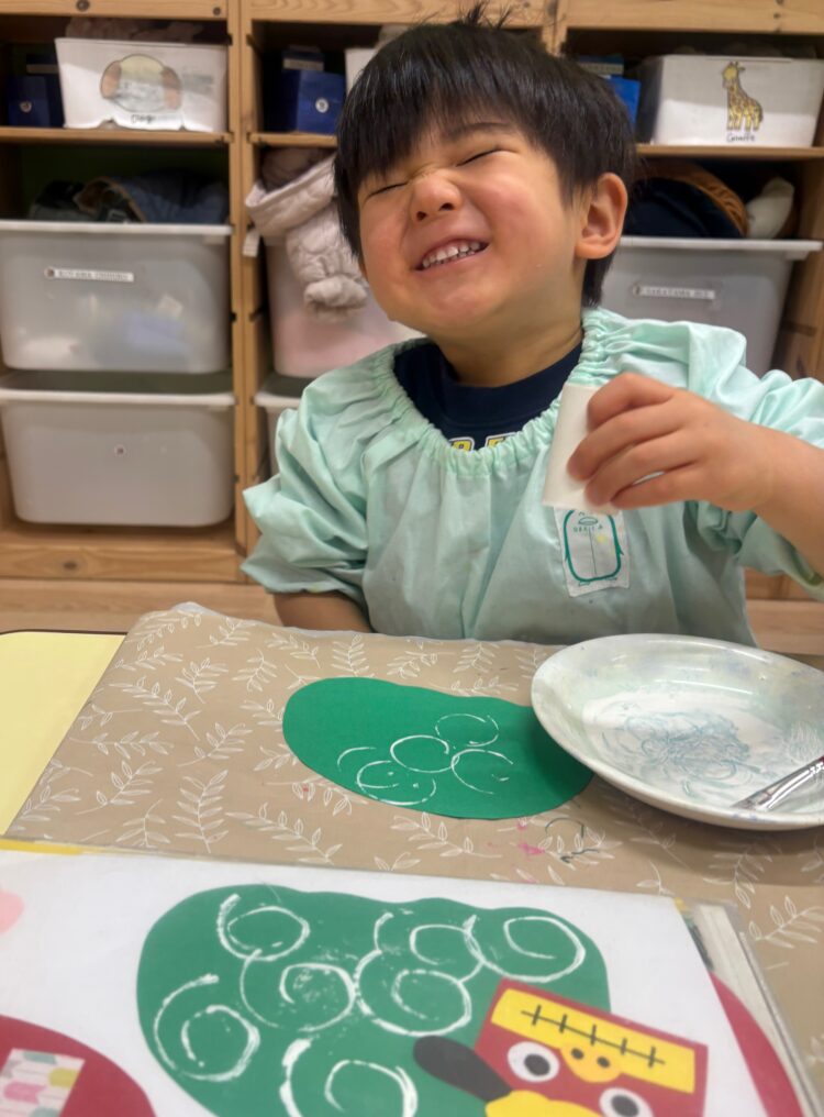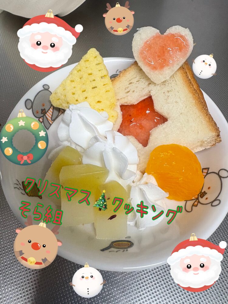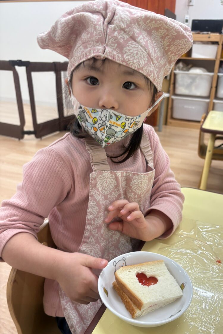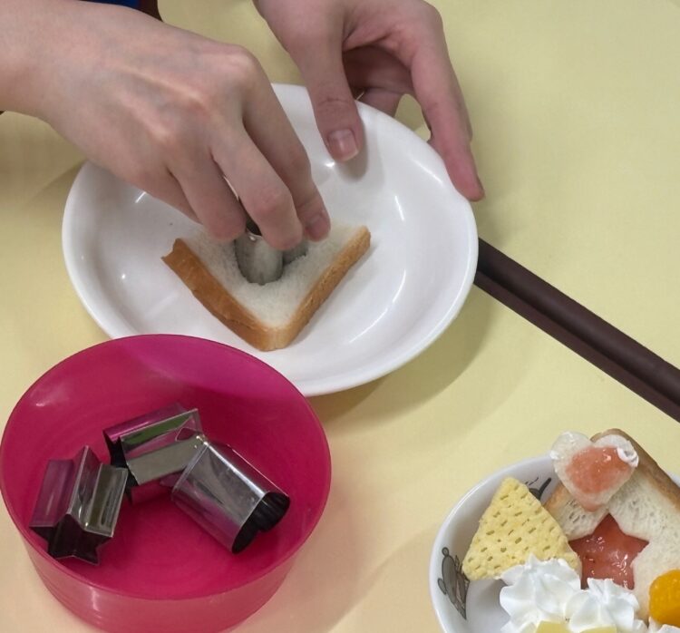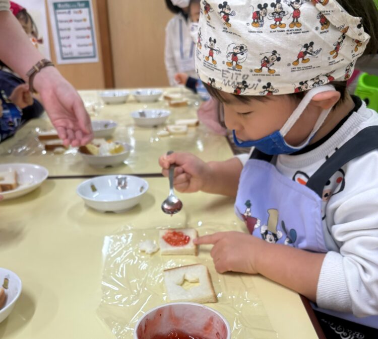 一人ひとりが自分のペースでクッキングを楽しみました。クリームをたっぷりのせる子、ちょんちょんと少しずつのせる子、パンをじっと見つめる子など、それぞれの個性がたくさん見られました👀