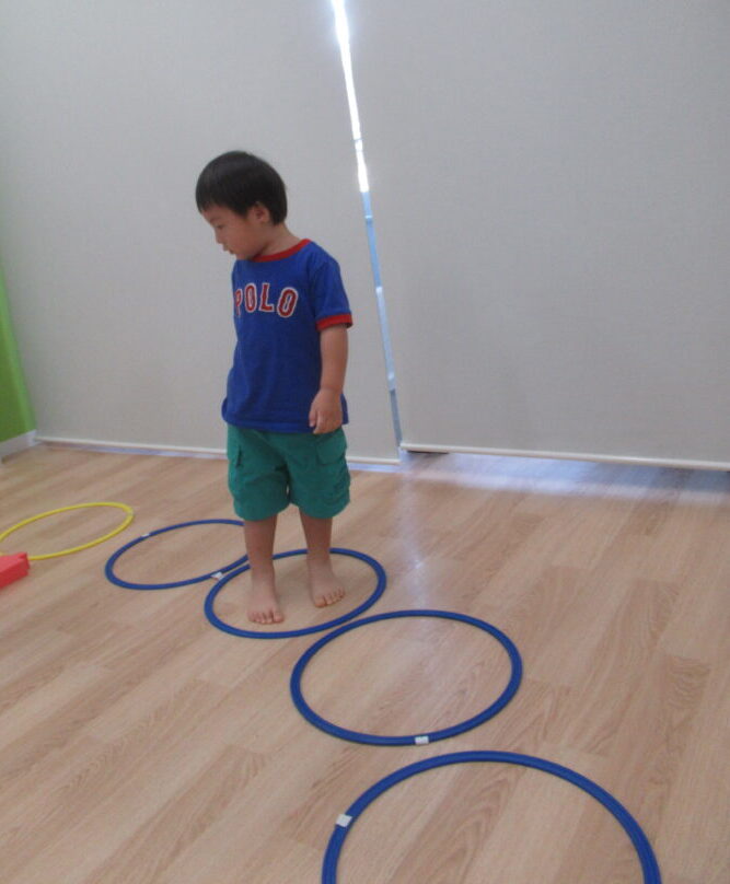 ジャンプ遊びに発展→ 平均台からフープジャンプする遊びも取り入れることで