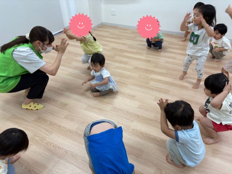 先生の真似や友だちと一緒に同じ動きをすることで強調性を育みます。