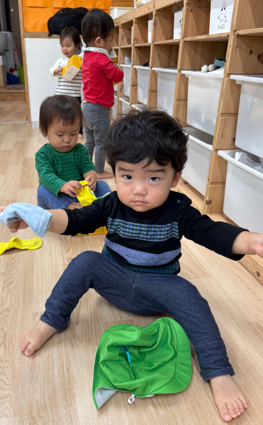 小さな手で、靴下の口ゴム部分を広げて足を入れたり、これから自分でやろうとする意欲が素晴らしいですね✨