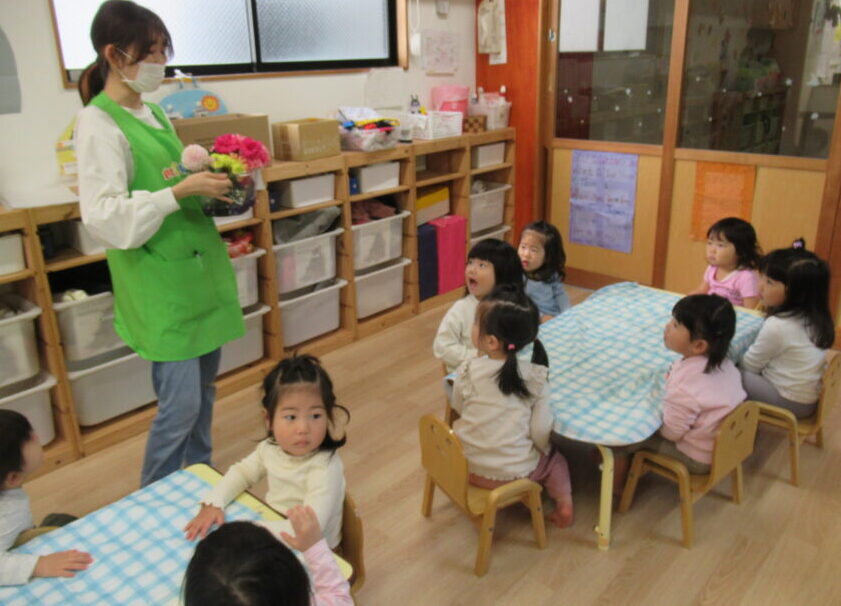 先生からお花の名前を聞くよ。