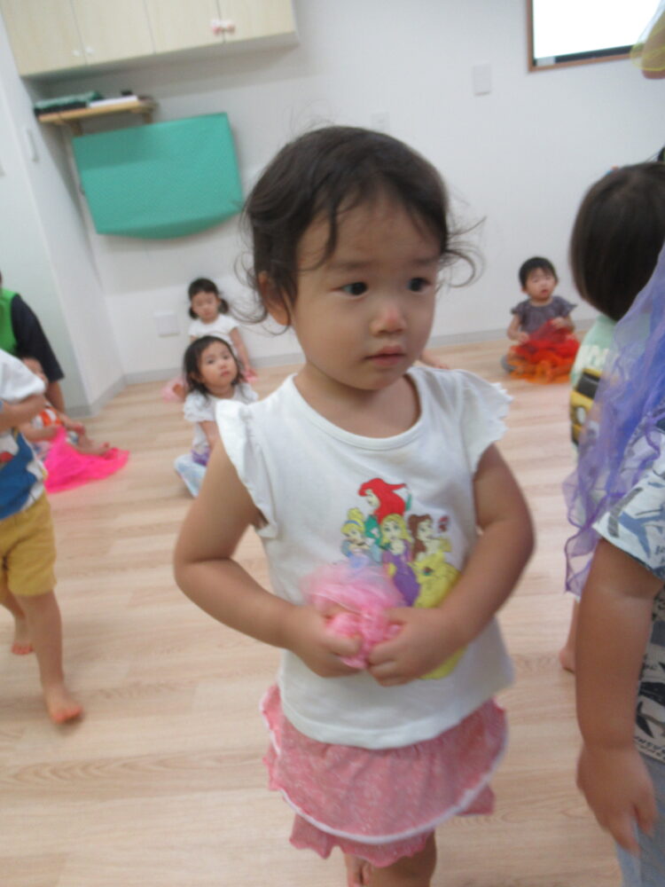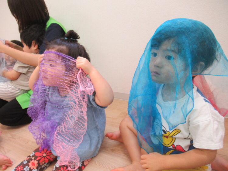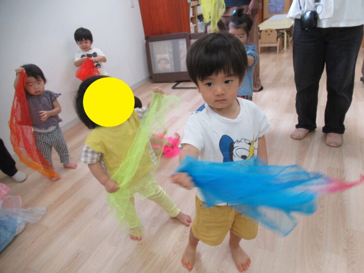 準備運動で体が温まってきたら、今度はリトミックスカーフを使い、先生の真似をしながら、いろいろ表現していきますよ。
