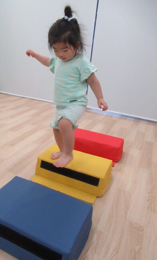 3個の小さな飛び箱の上を渡るよ