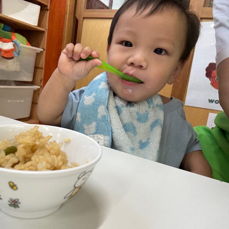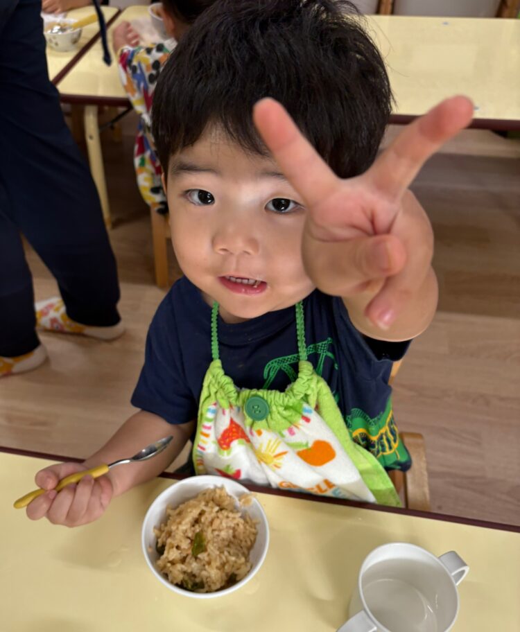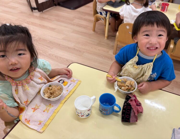 「ピーマン苦手〜」という声も聞こえてきましたが、炊き込みご飯の中に入っていると、いつもより食べやすかったようで、ひと口、ふた口と挑戦する姿がたくさん見られました。