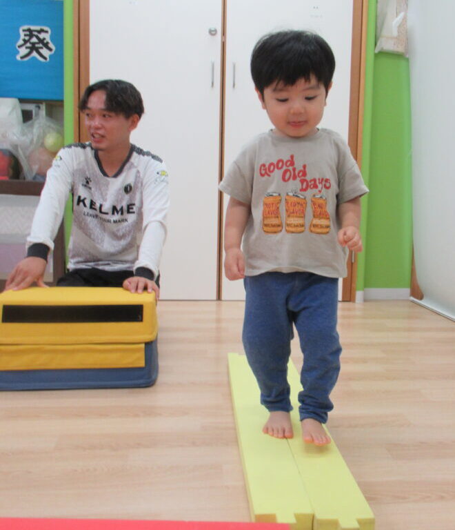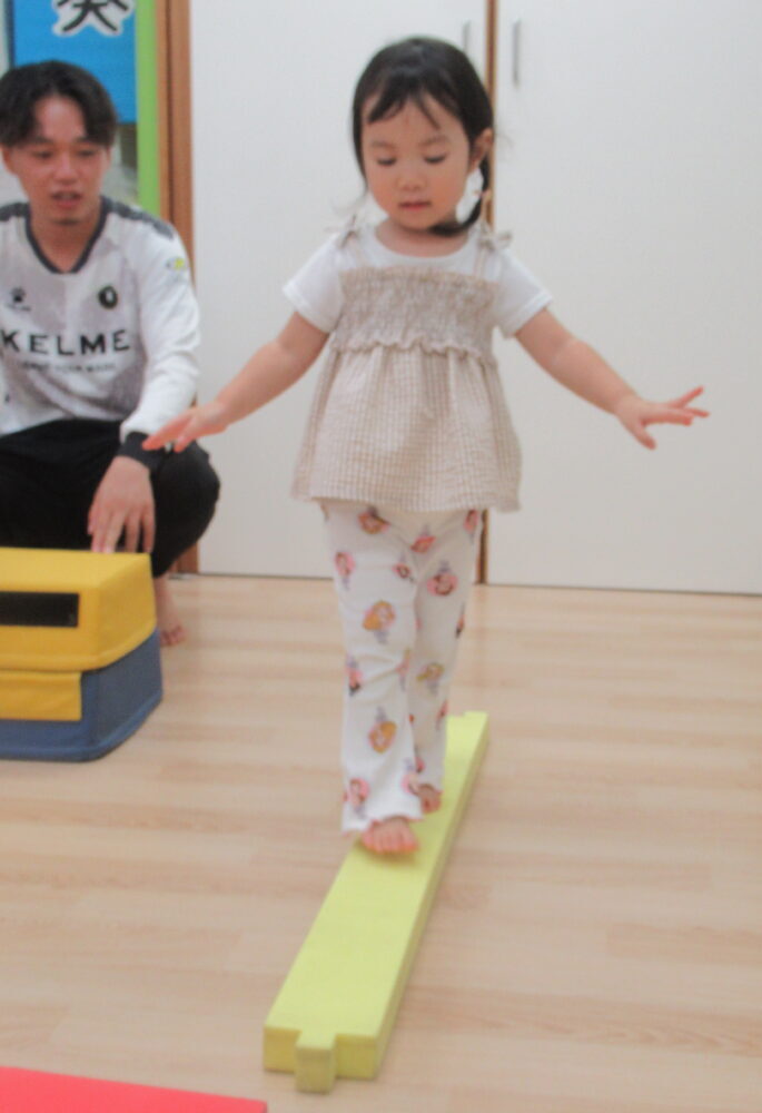 平均台では、体のバランスを保ちながら落ち着いて歩くことを練習しています。