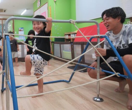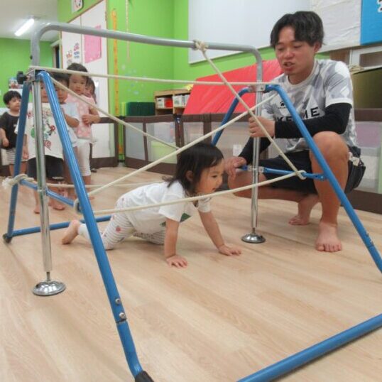 鉄棒にロープをジグザグに配置してその中をくぐっていく遊びです。