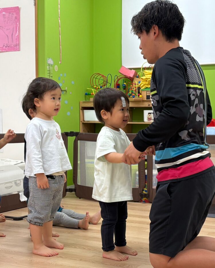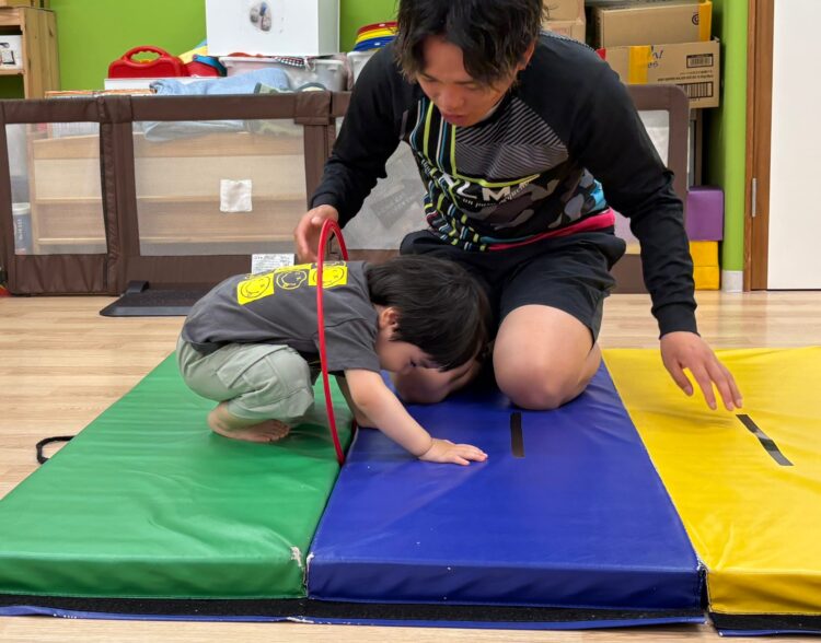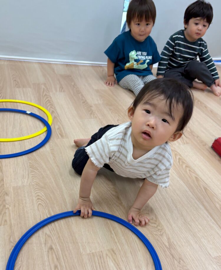 体操教室で行うリング運動(リングをくぐる)は、子どもの身体能力の向上やバランス感覚の育成に役立つ運動遊びです。リングをくぐることで、空間認知能力や身体認知能力も養われます![]()