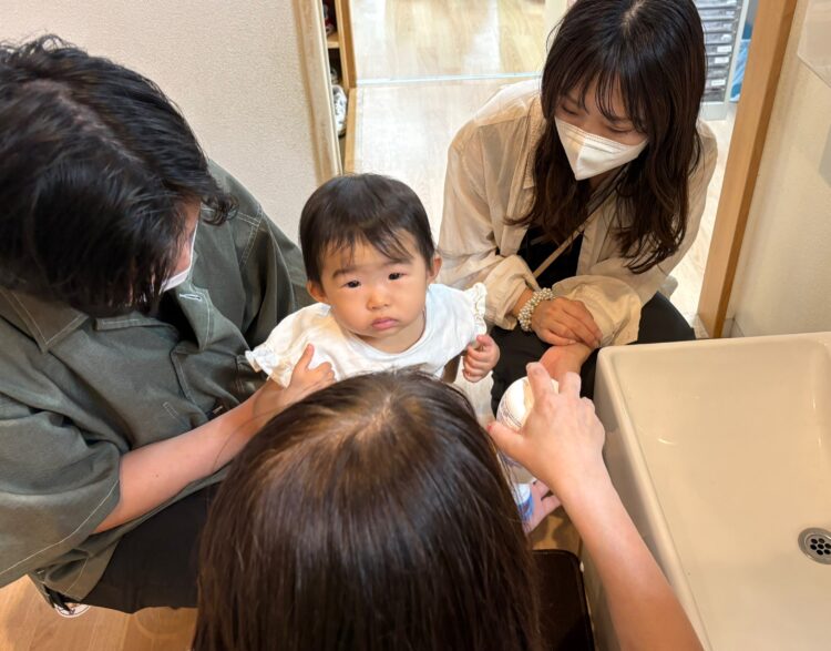 手洗いのお歌を、「おねがい~♪か~めさん♪」と口ずさみながら、手洗いの練習に励みました![]()