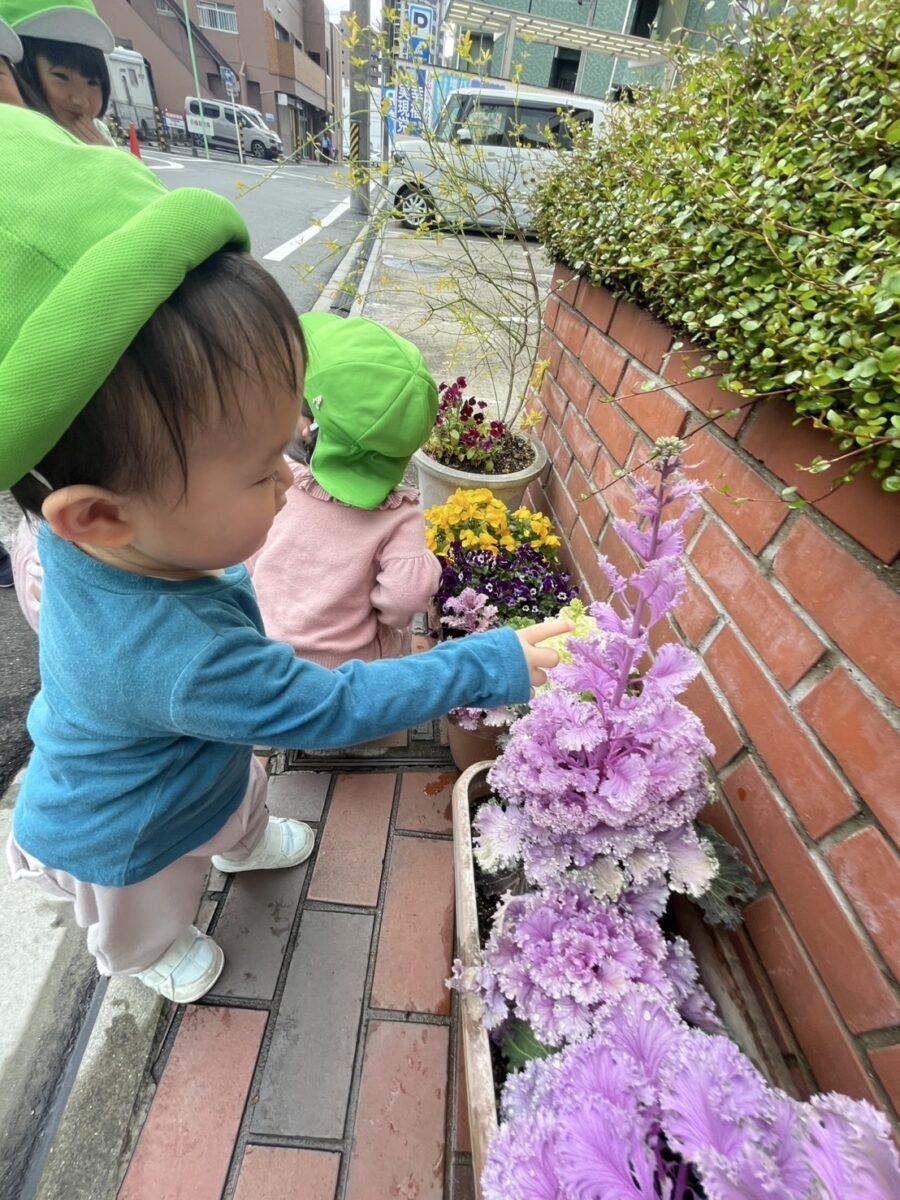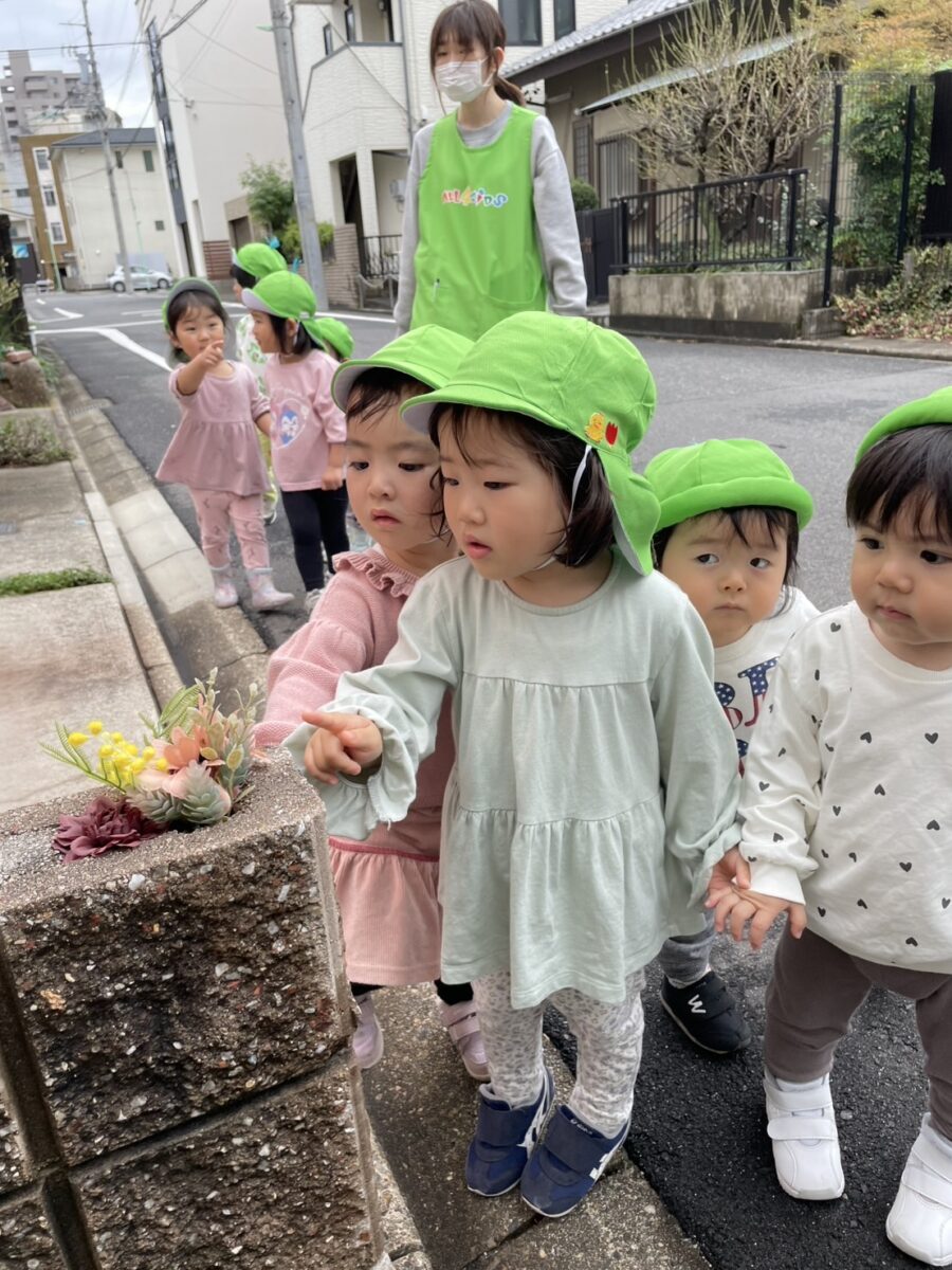 戸外遊びを通して季節や自然の変化に気づく、交通ルールを理解、社会性を身につけるなどねらいをもち戸外に出掛けます。