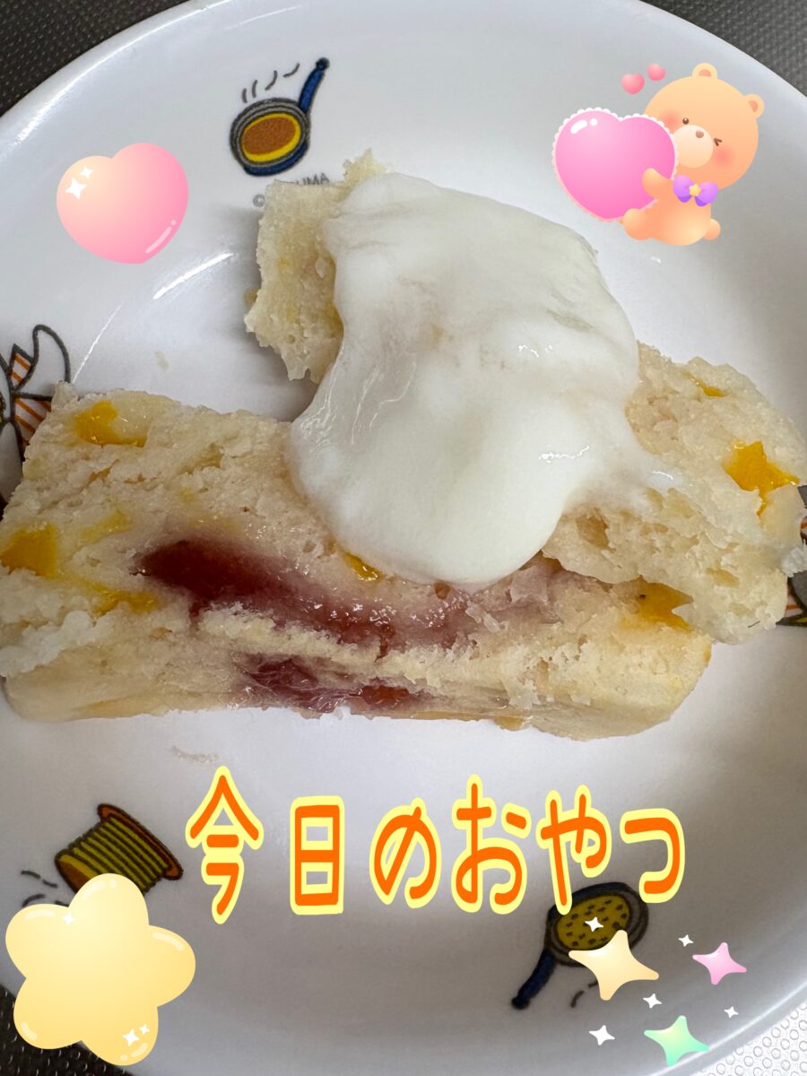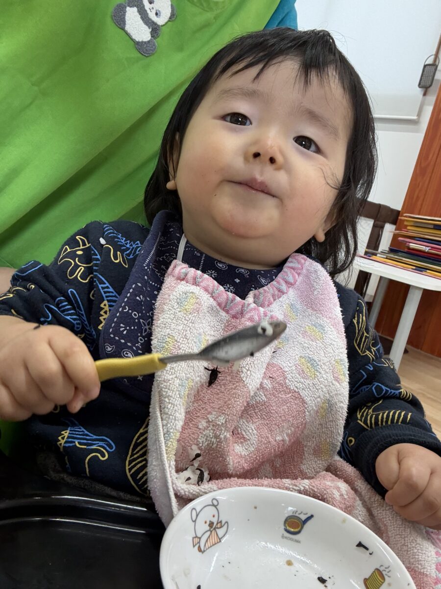 食べることを喜び、スプーンやフォークを使って自分で食べています![]()