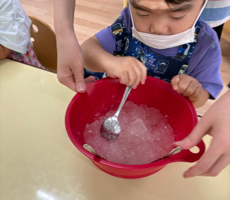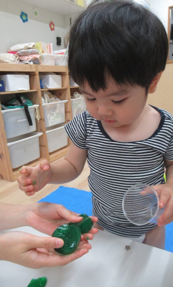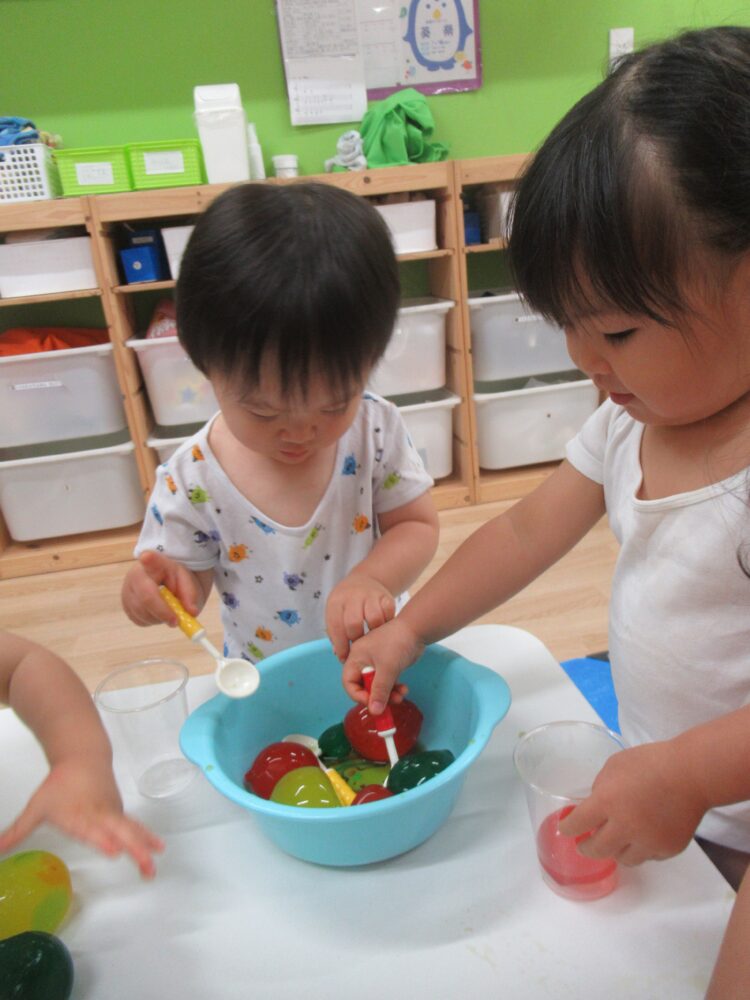 寒天あそびには、冷たさ、柔らかさ、プルプルとした感触を味わう他にも、ちぎる、つまむなどの動作を通して、手先の感覚を養うこともできます✨