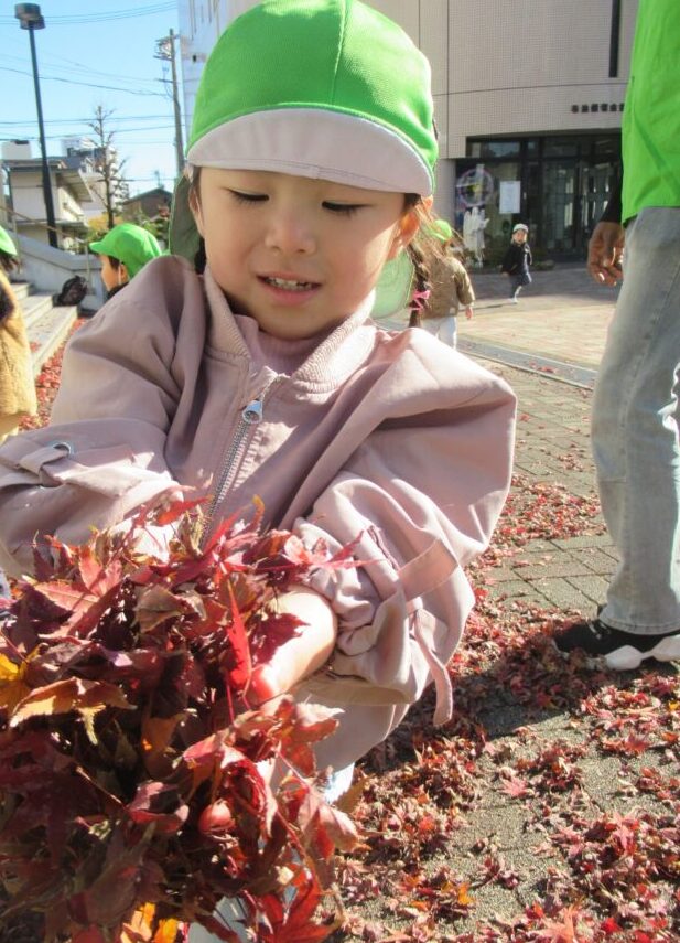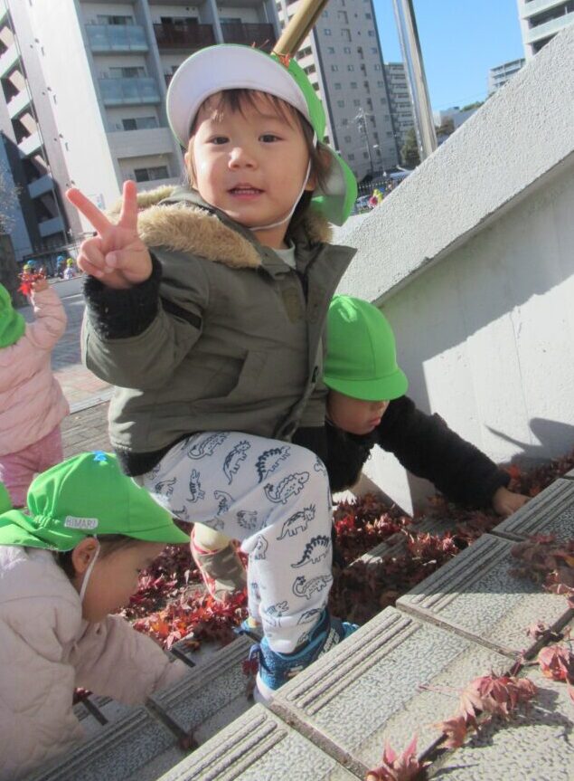 保育士と手をつなぎながら、冬の景色や木々の葉の色の変化を観察しました🍂
