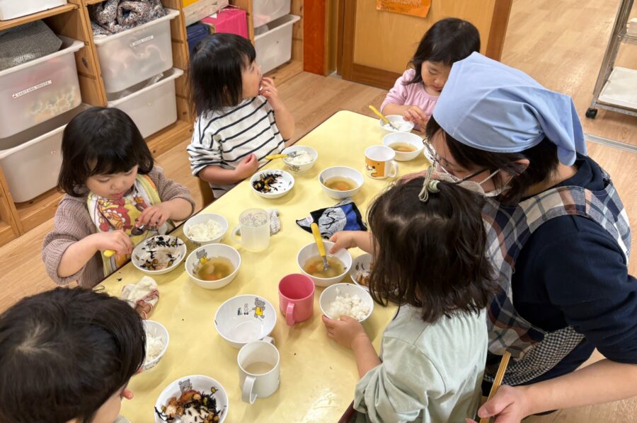今週から、卒園児さんは先生や他のクラスのお友だちと一緒に給食を食べます🍴