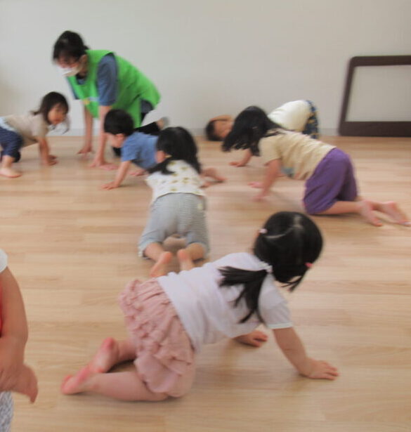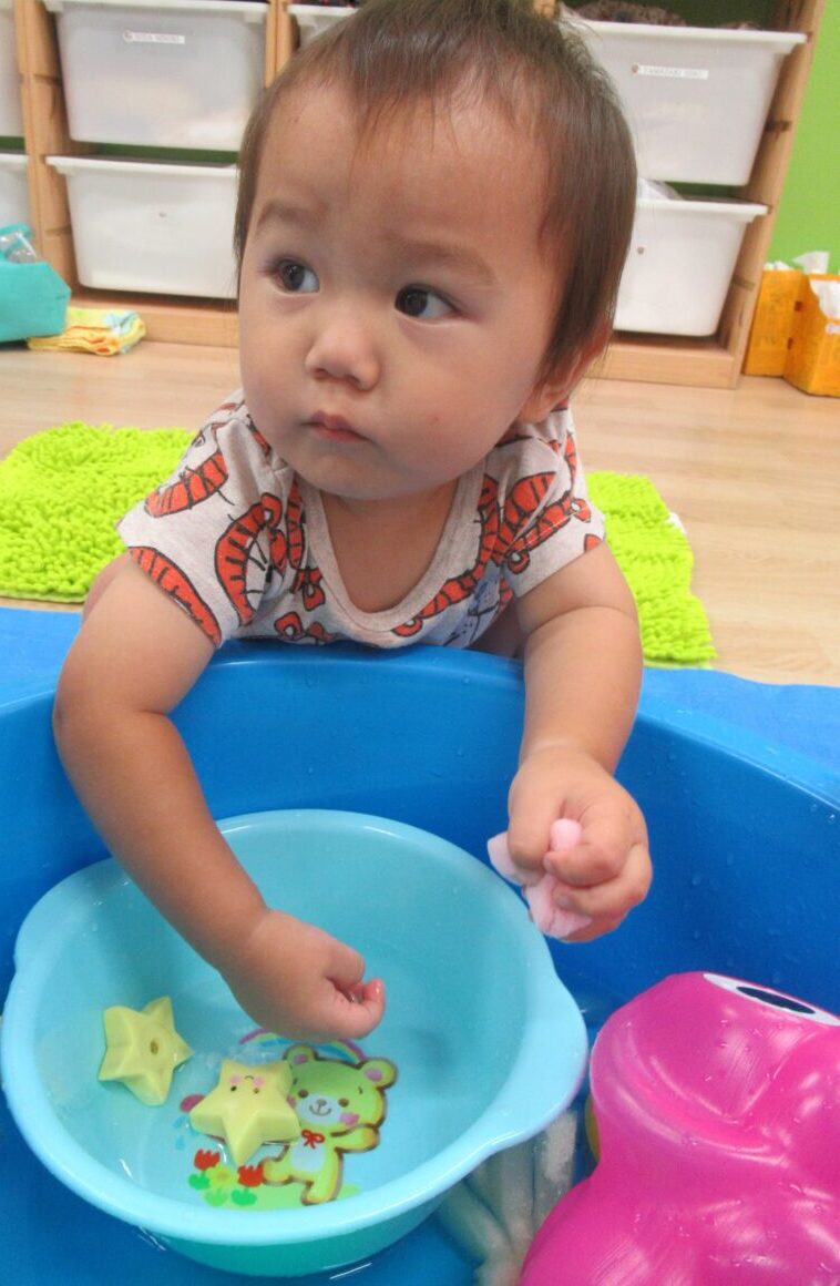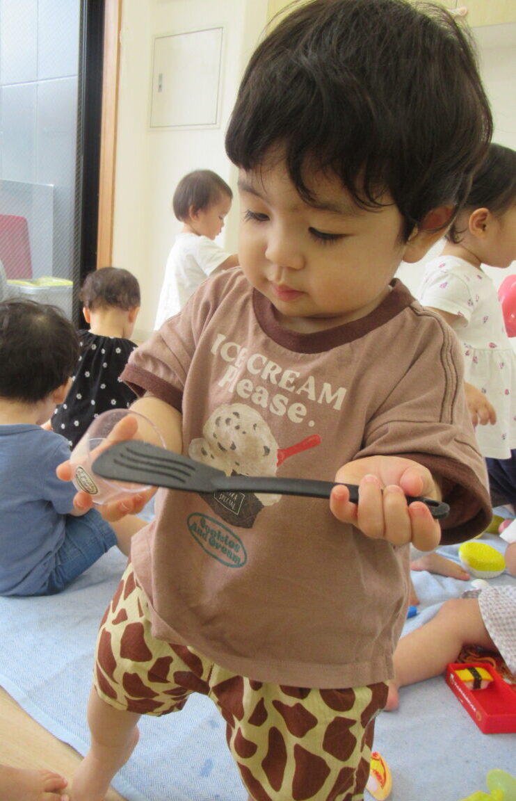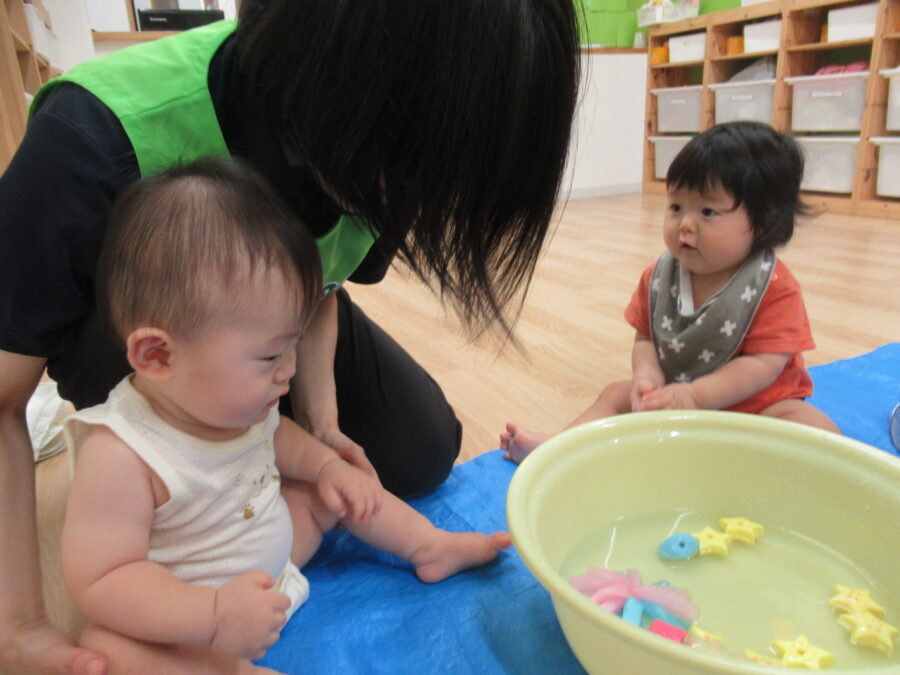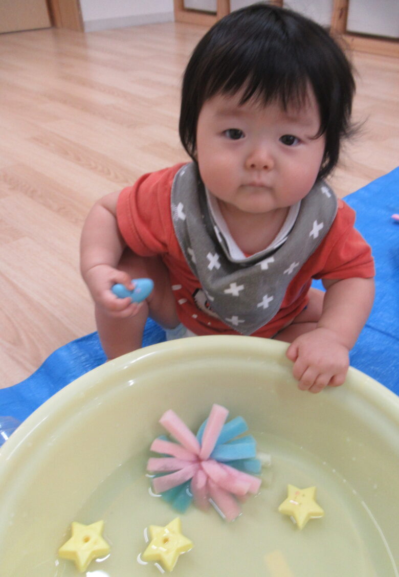 暑い日が続き、戸外遊びは中々出来ませんが室内で水遊びを楽しんでいます。
