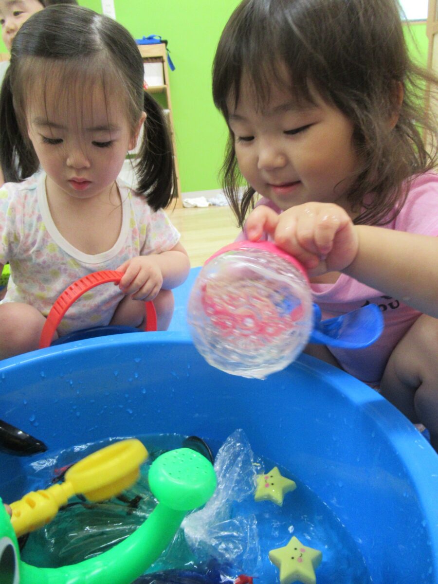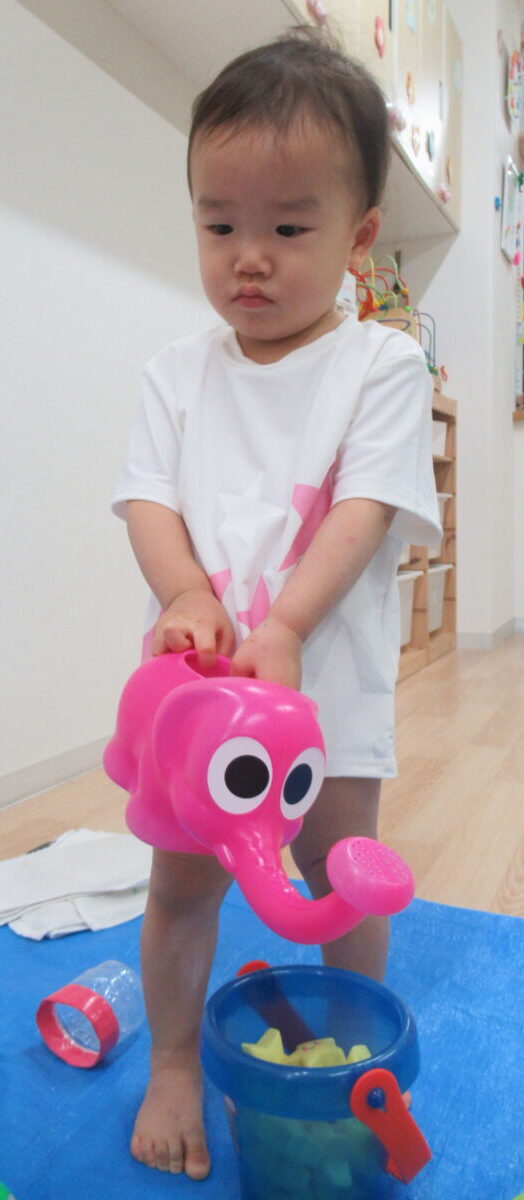 お部屋の中にブルーシートを広げてタライを出して水遊びしました。