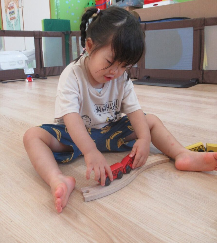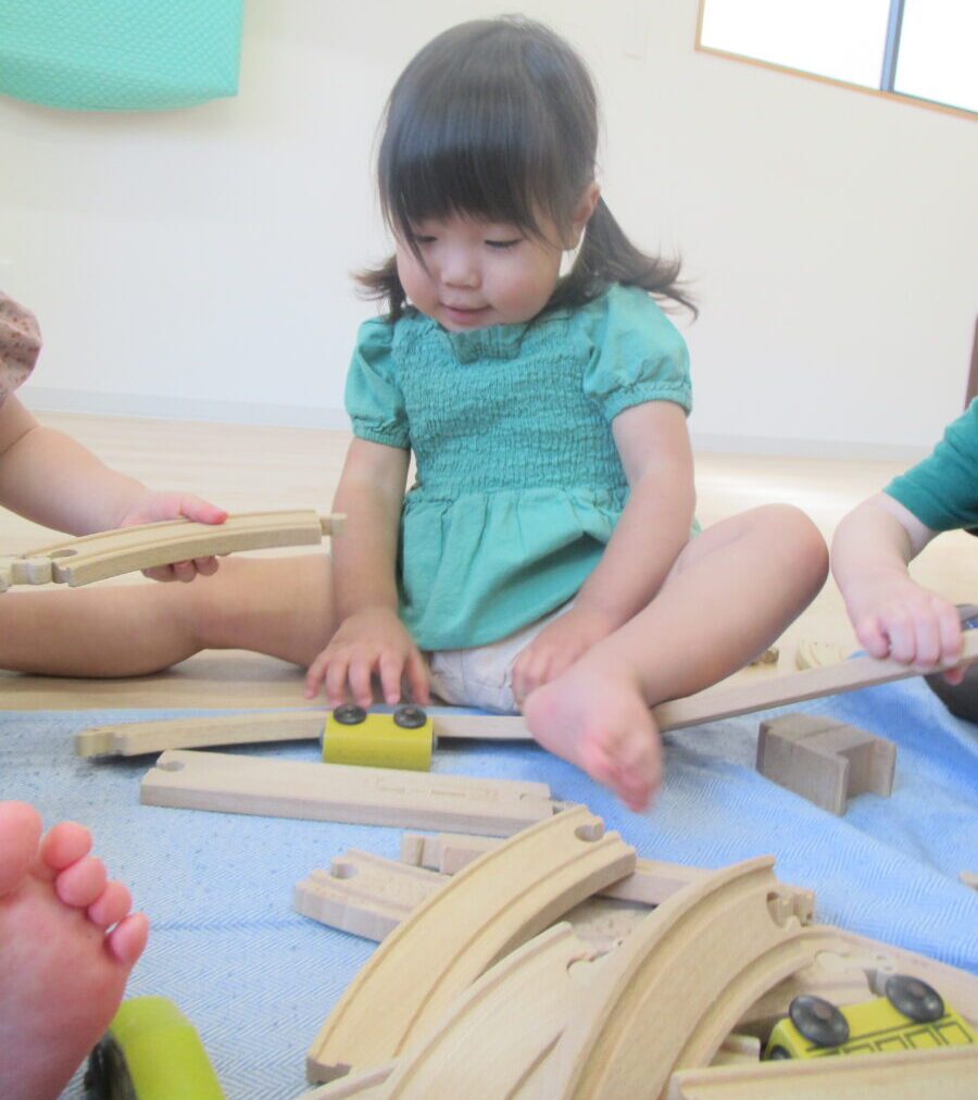 広い空間にお友だちと協力して線路をつなげるよ。