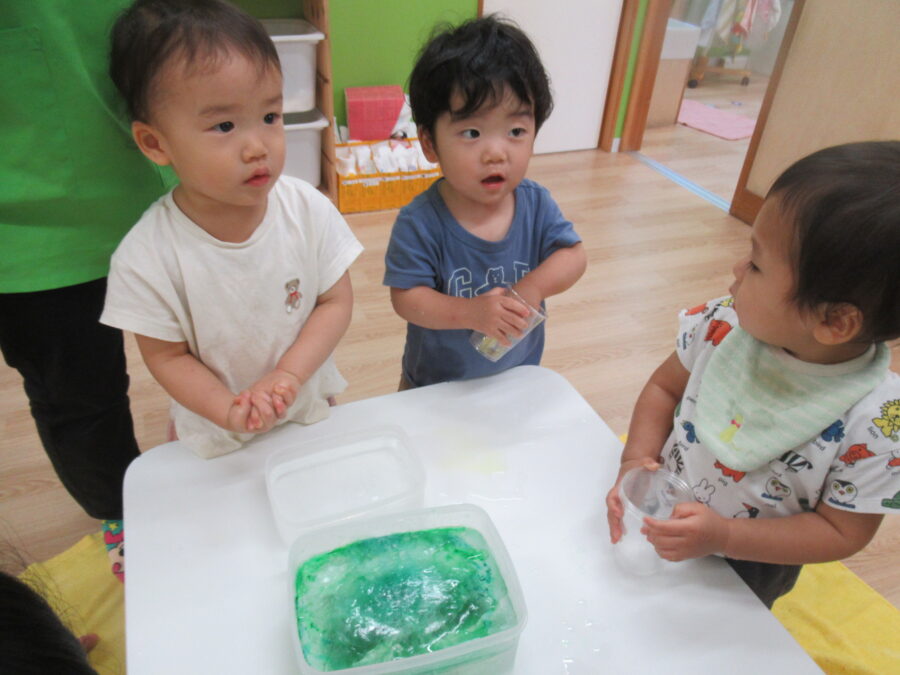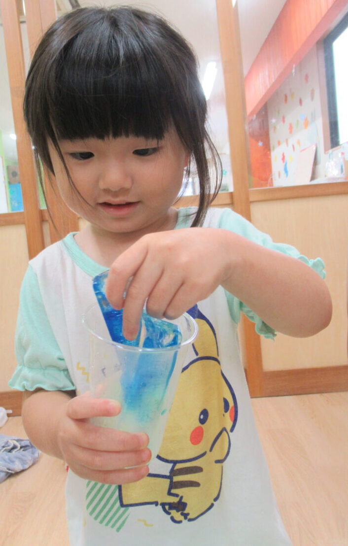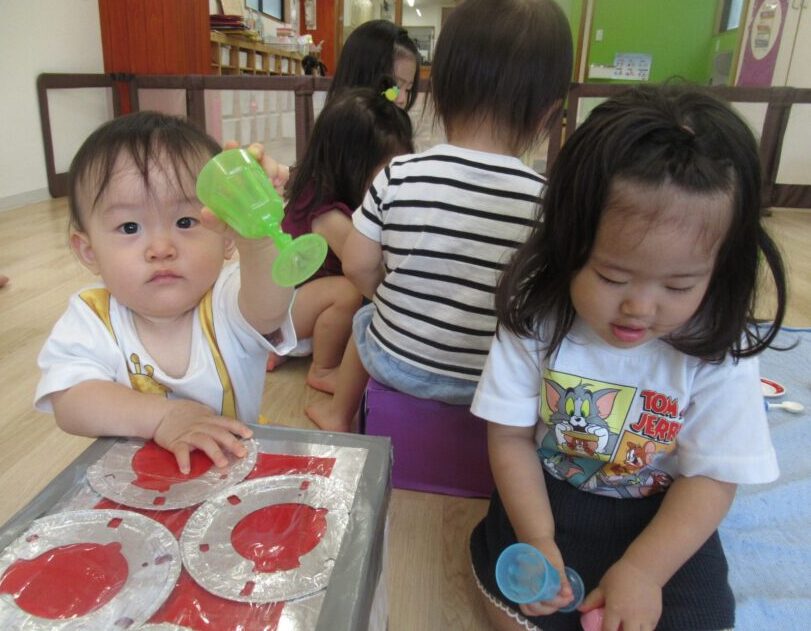 おままごとを通して、「飲むふり」「食べるふり」など、ふり遊びも上手に出来ています。