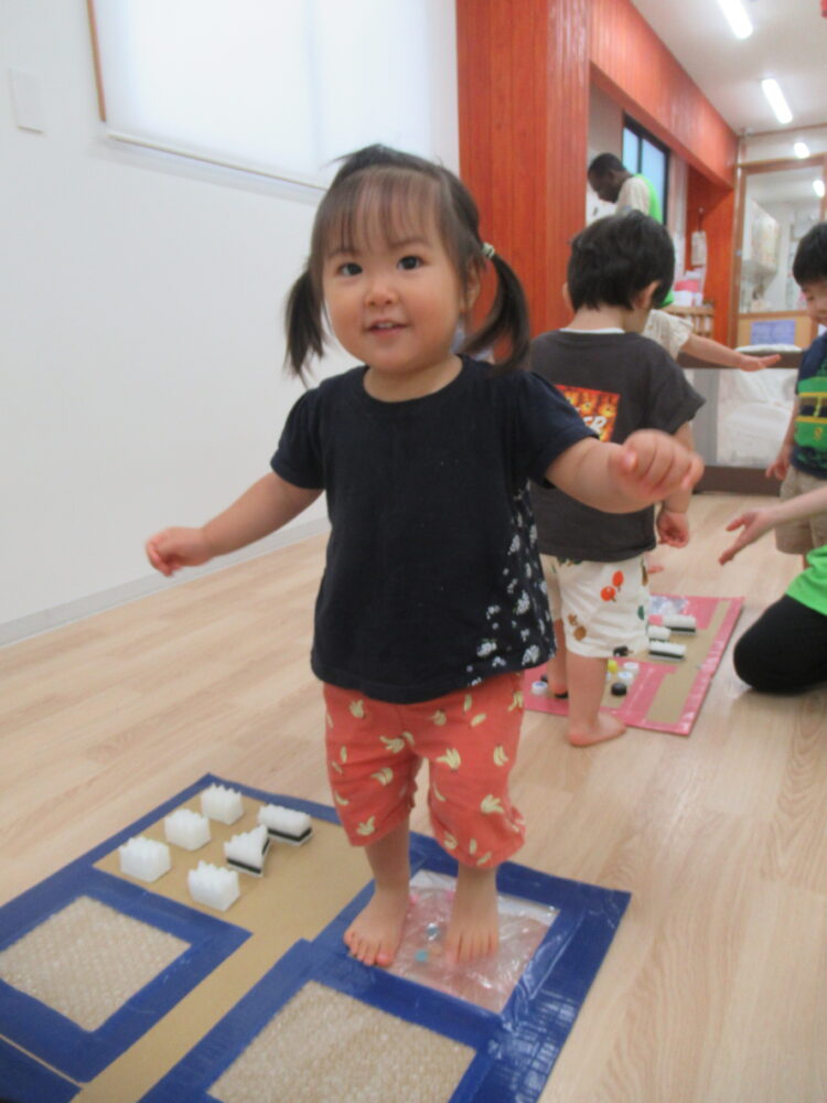 別室では、感触マットと積み木などコーナー遊びをしました。