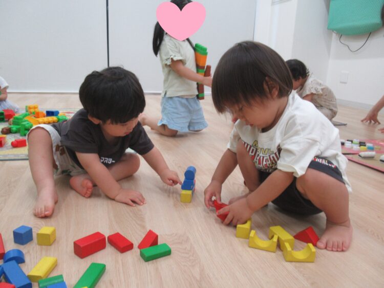 こちらでは、積み木をお友だちと一緒に並べて楽しんでいます。