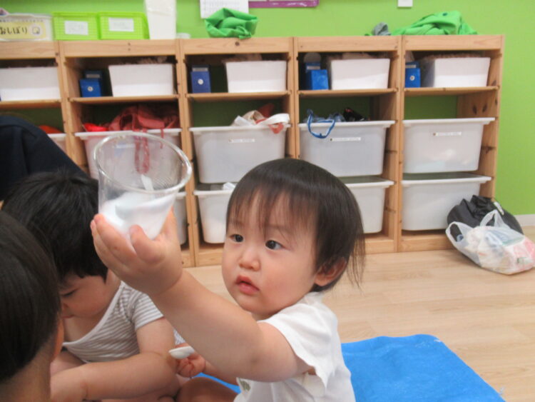 たくさん入ったかな~❔コップから泡の様子を見てみよう。