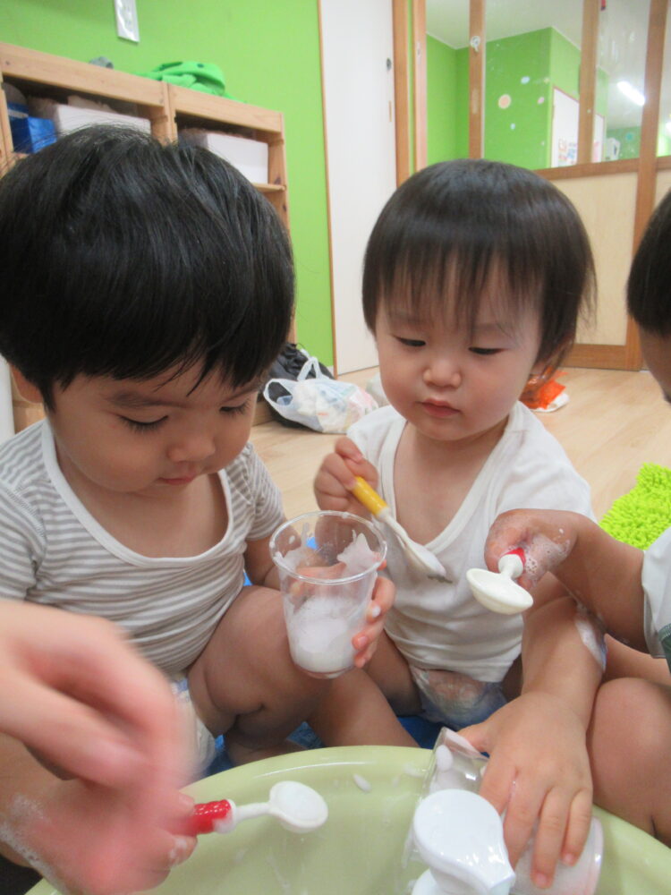 泡の性質を楽しむと共に、お友だちとも関わりながら遊んでいますね(^^♪