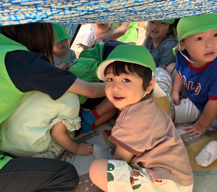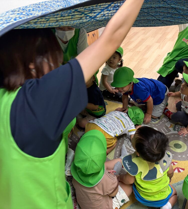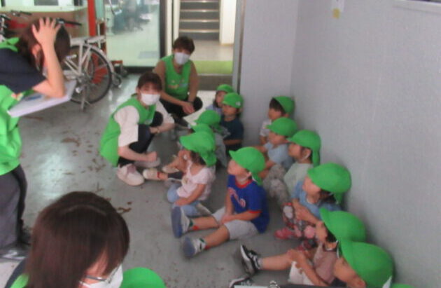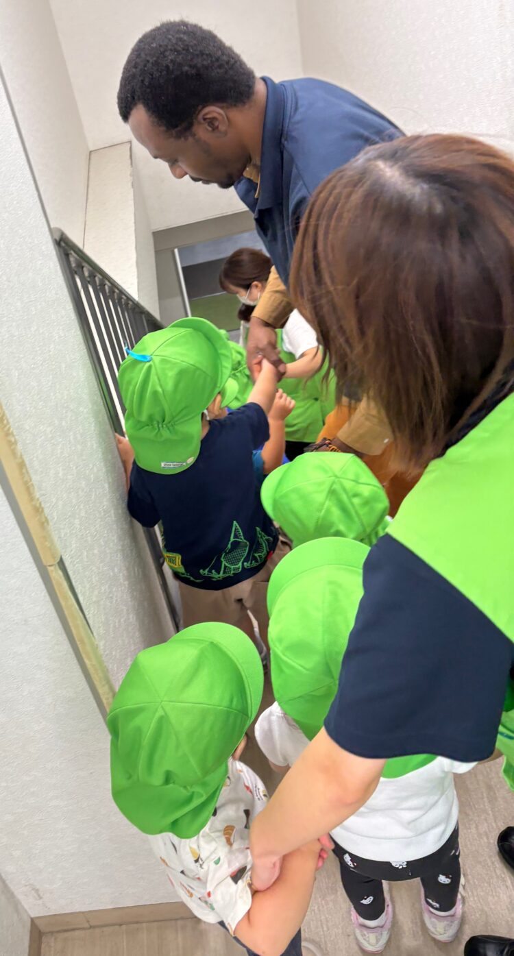避難時も慌てることなく、先生の話をしっかり聞いて、落ち着いて行動することができましたよ。靴を履くのが難しい子も、先生やお友だちと協力しながら無事に避難することができました✨