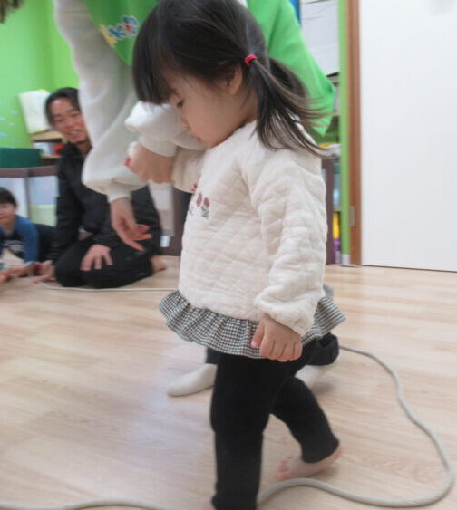 最初は縄をへびに見立てその上を落ちないように歩いたり、