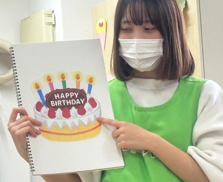 お友だちから「おめでとう」の言葉をもらったり、歌のプレゼントやお誕生日カード、先生から出し物の「トントントンだあれ?」スケッチブックシアターを見て笑顔あふれる時間になりました。