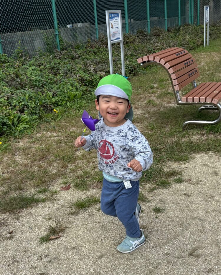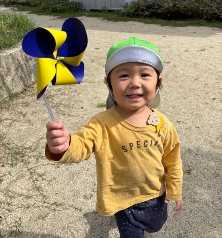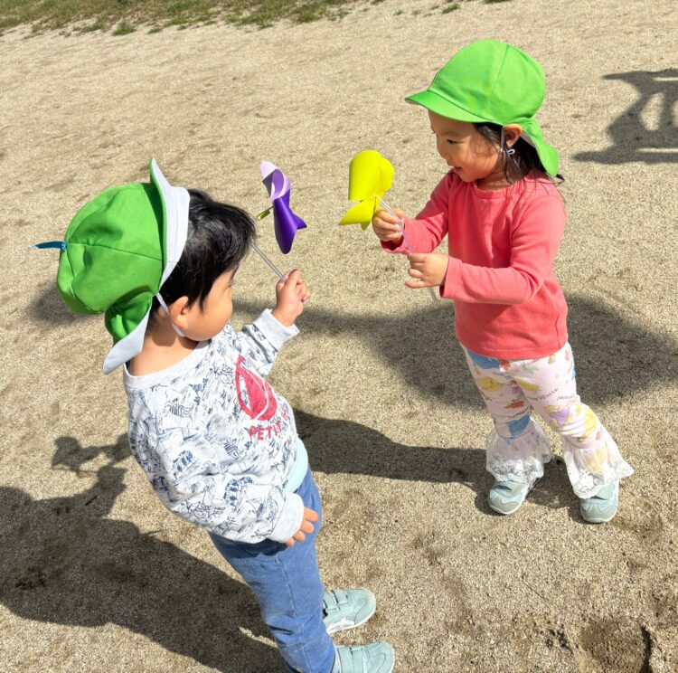 今日は、戸外で「風車あそび」を楽しみました。